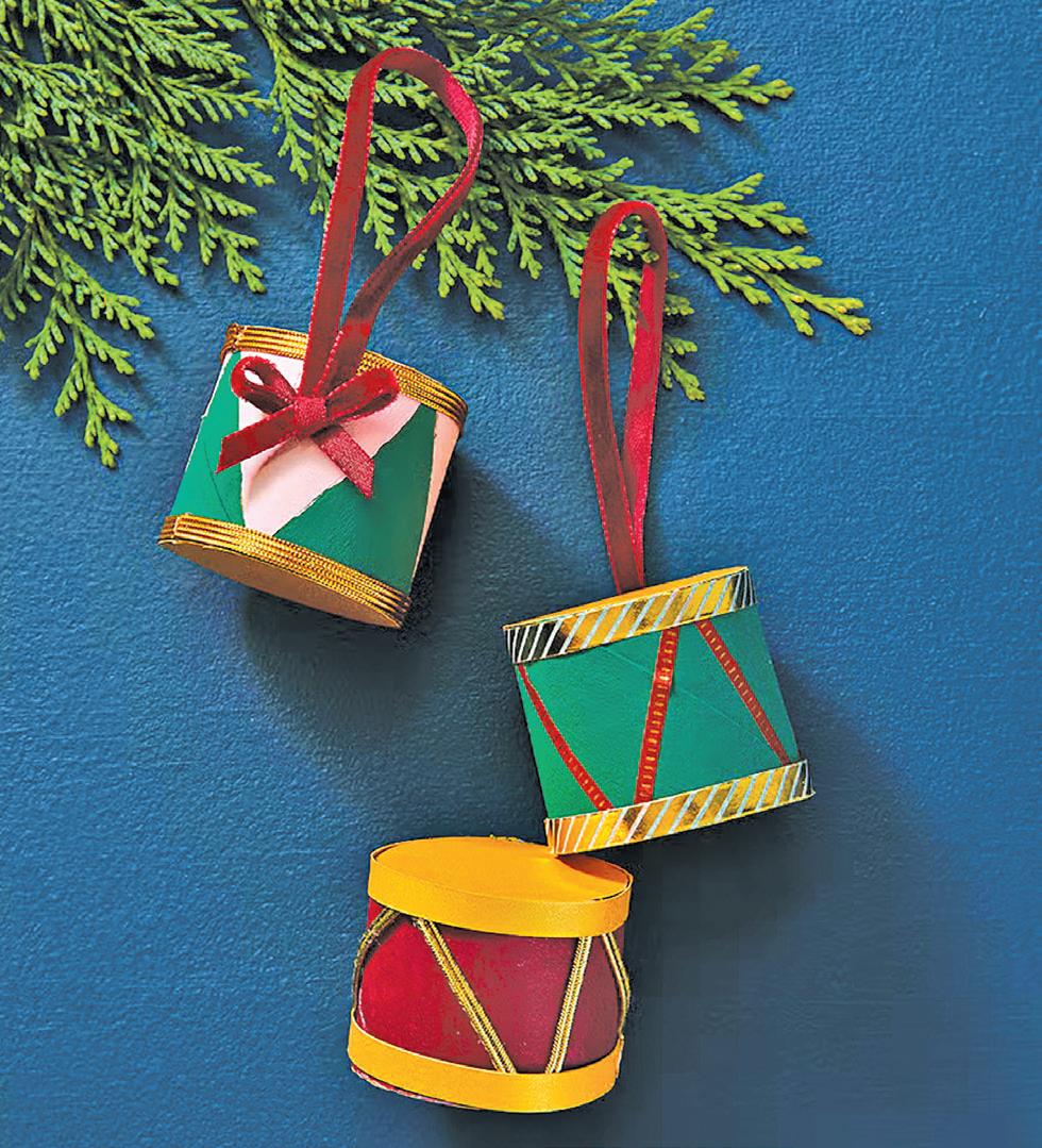 Would you believe that these adorable drum ornaments are crafted from old toilet paper rolls? With a bit of paint, tape and ribbon, the once paper rolls are completely unrecognizable.