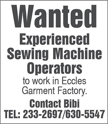 Male and Female to work in factory. Apply in person to R.P’s Enterprise, Area ‘K’ Le Ressouvenir East Coast Demerara. Tel.# - 220-2818.