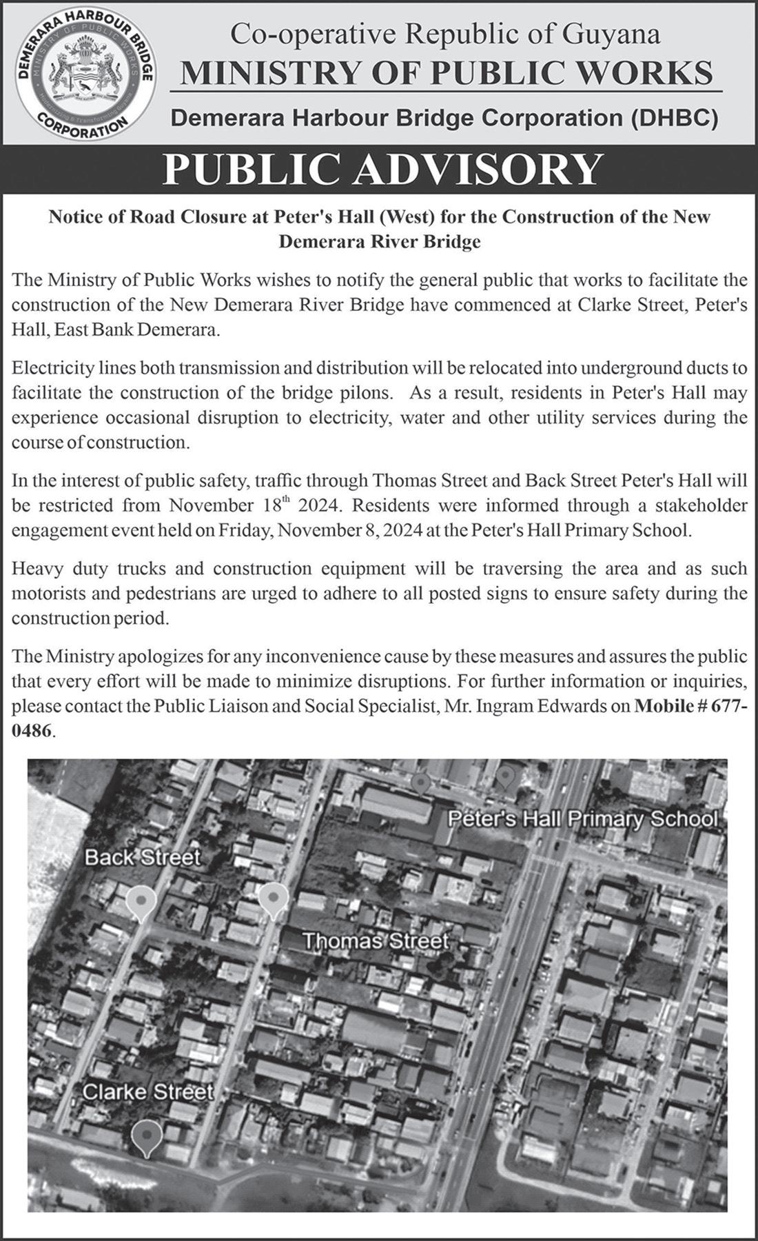 The Demerara Harbour Bridge will be closed to vehicular traffic on: