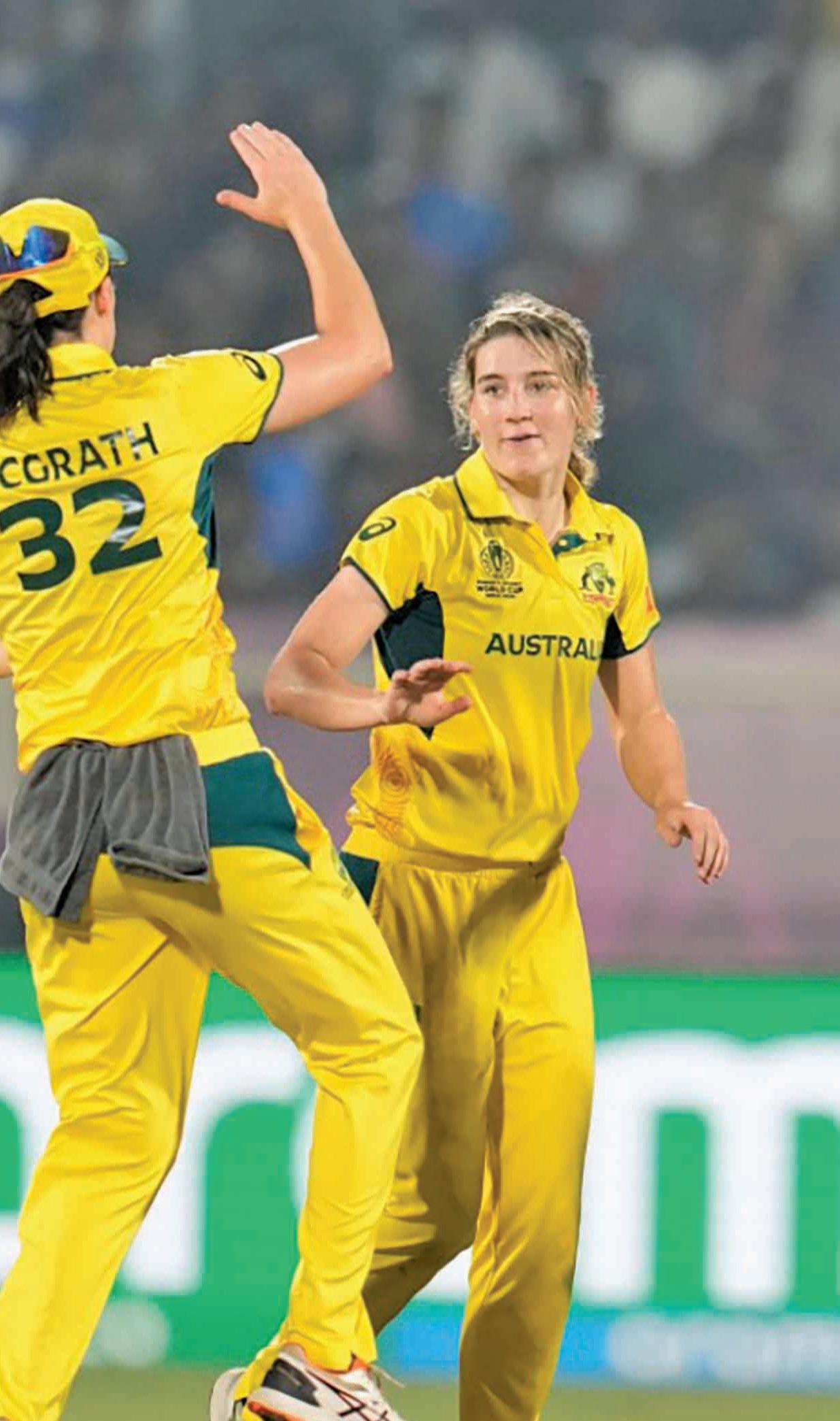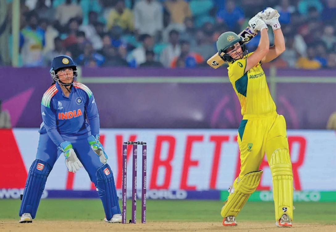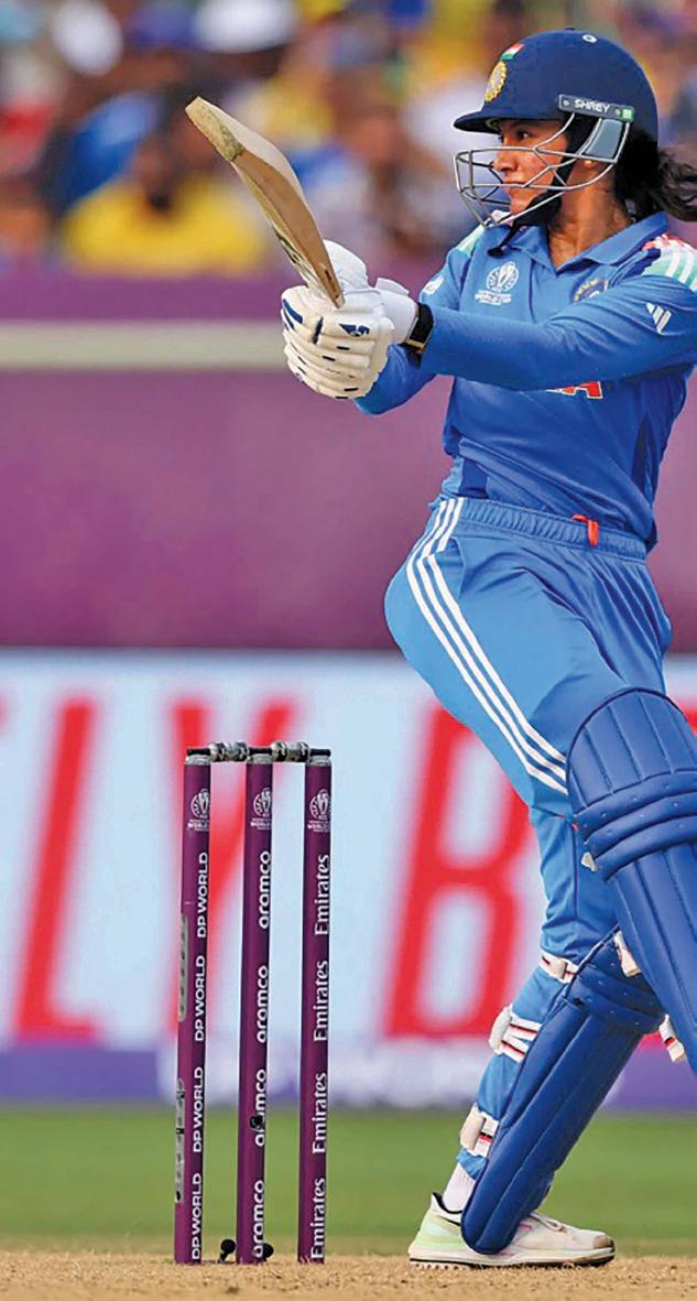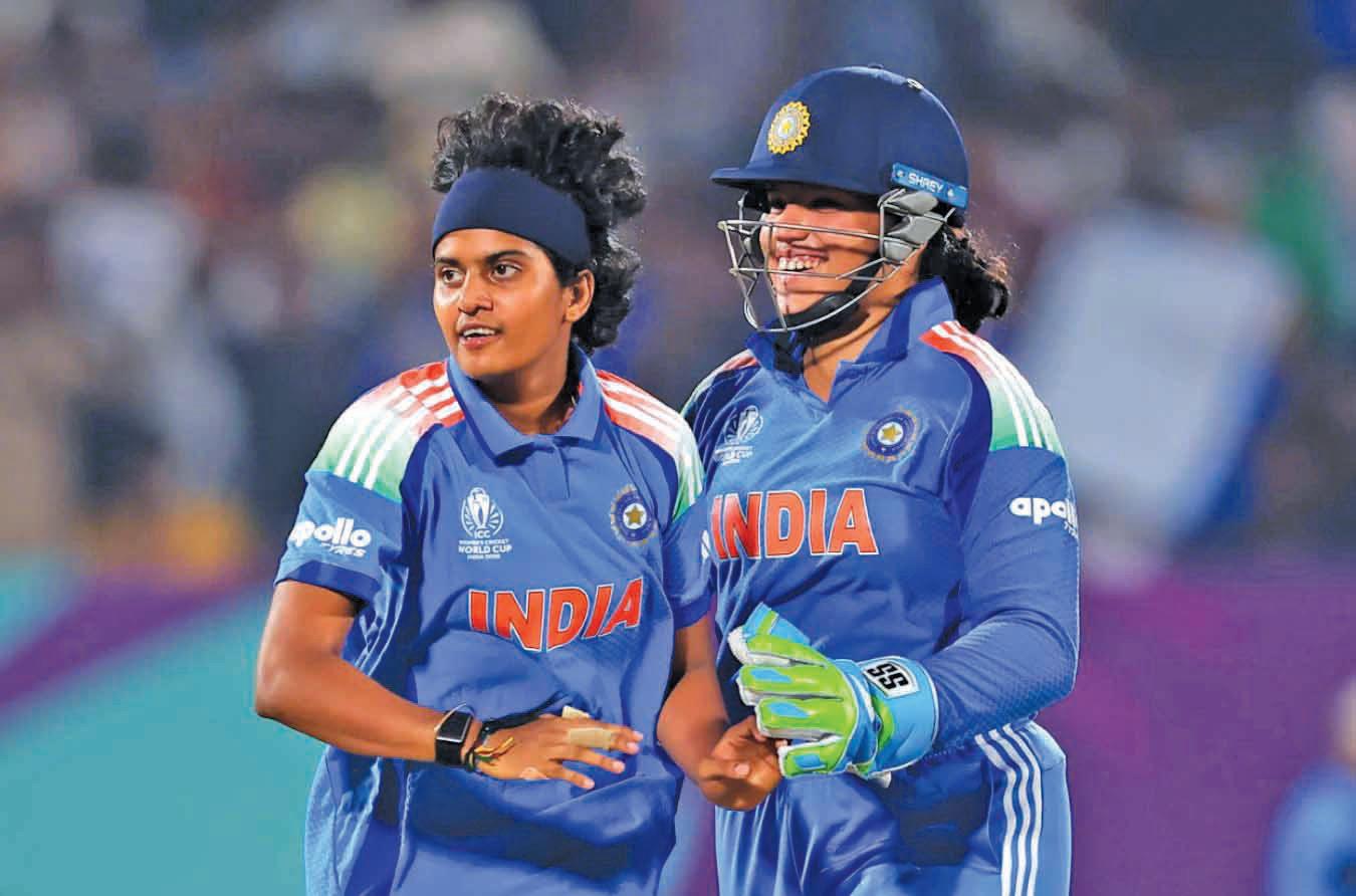 Fall of wickets: 1-155 (Smriti Mandhana, 24.3 ov), 2-192 (Pratika Rawal, 30.1 ov), 3-234 (Harmanpreet Kaur, 36.3 ov), 4-240 (Harleen Deol, 37.2 ov), 5-294 (Richa Ghosh, 42.6 ov), 6-309 (Jemimah Rodrigues, 44.5 ov), 7-320 (Deepti Sharma, 46.4 ov), 8-327 (Amanjot Kaur, 47.3 ov), 9-330 (Kranti Gaud, 48.3 ov), 10-330 (Shree Charani, 48.5 ov)