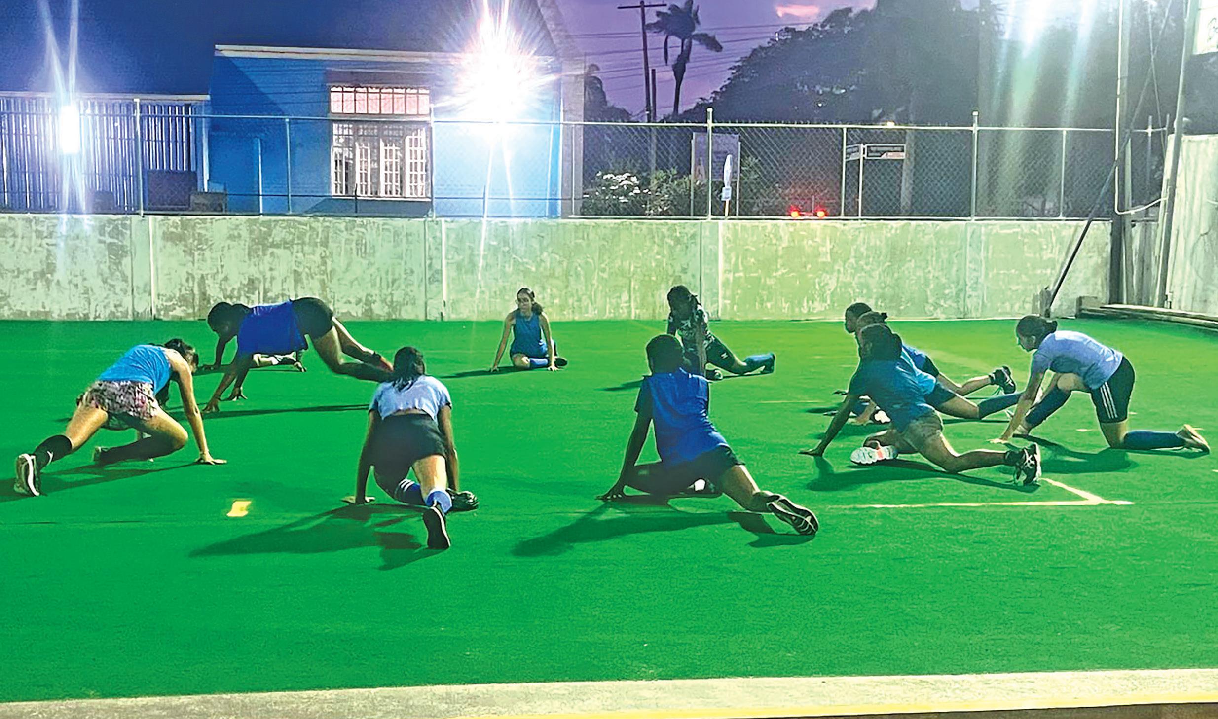 The Guyana Girls Under-21 Hockey Team in stretching session