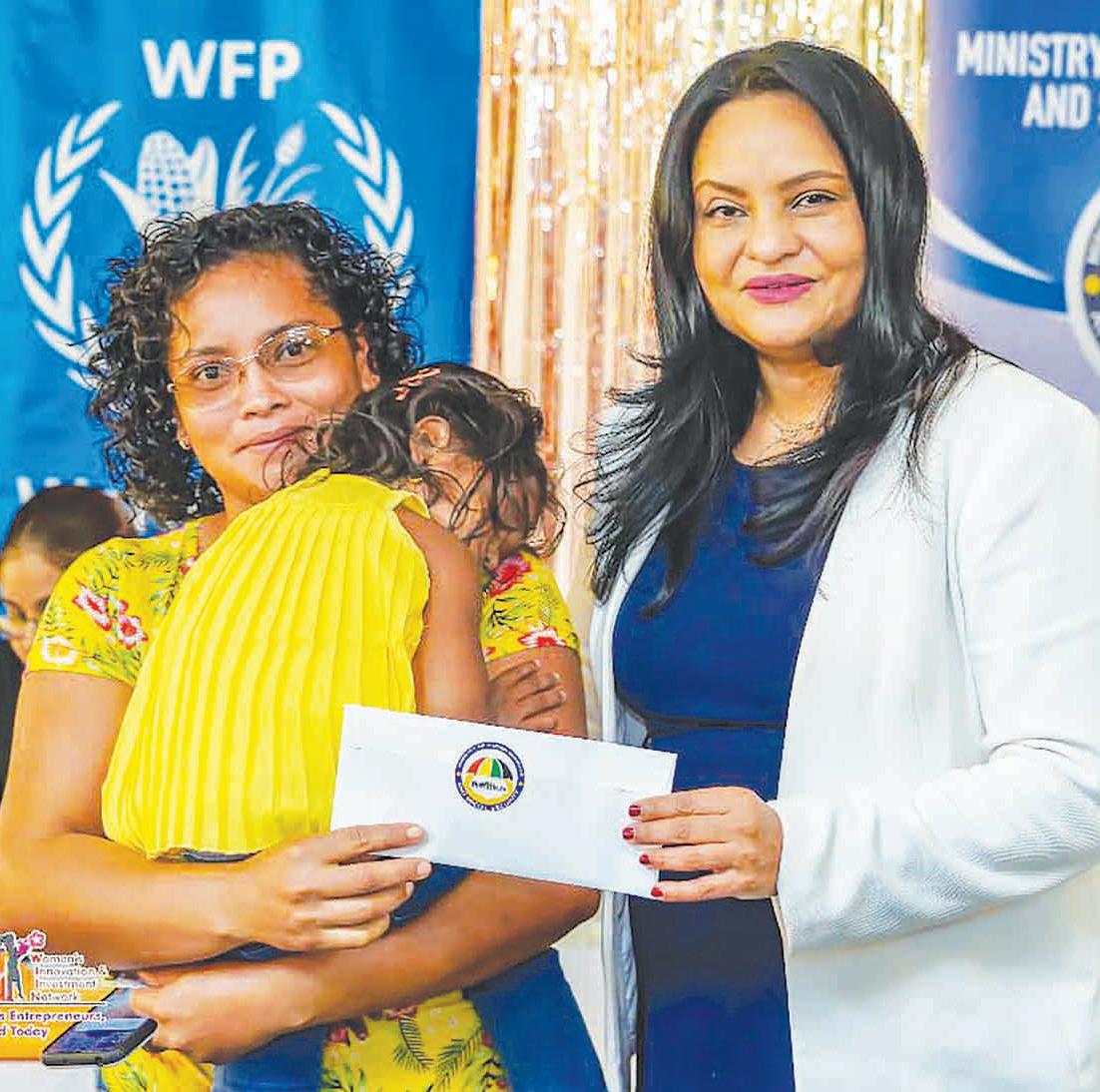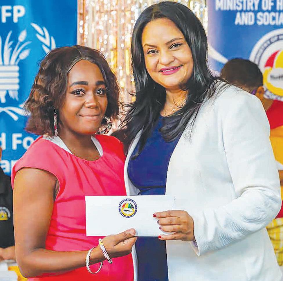 Monique Allicock, Sales Representative of the South Road branch of Trophy Stall, handing over the sponsorship cheque to LGC PRO Paton George in the presence of LGC Secretary Chet Bowling