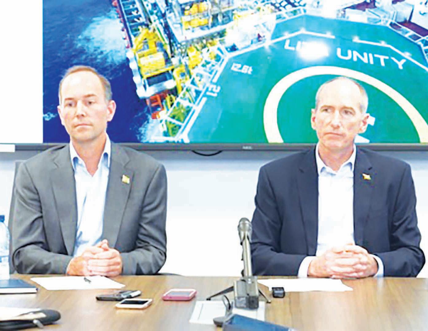 ExxonMobil Guyana President Alistair Routledge (right) and Business Service Manager Phillip Rietema during Friday’s press engagement at the company’s Duke Street, Kingston Head Office