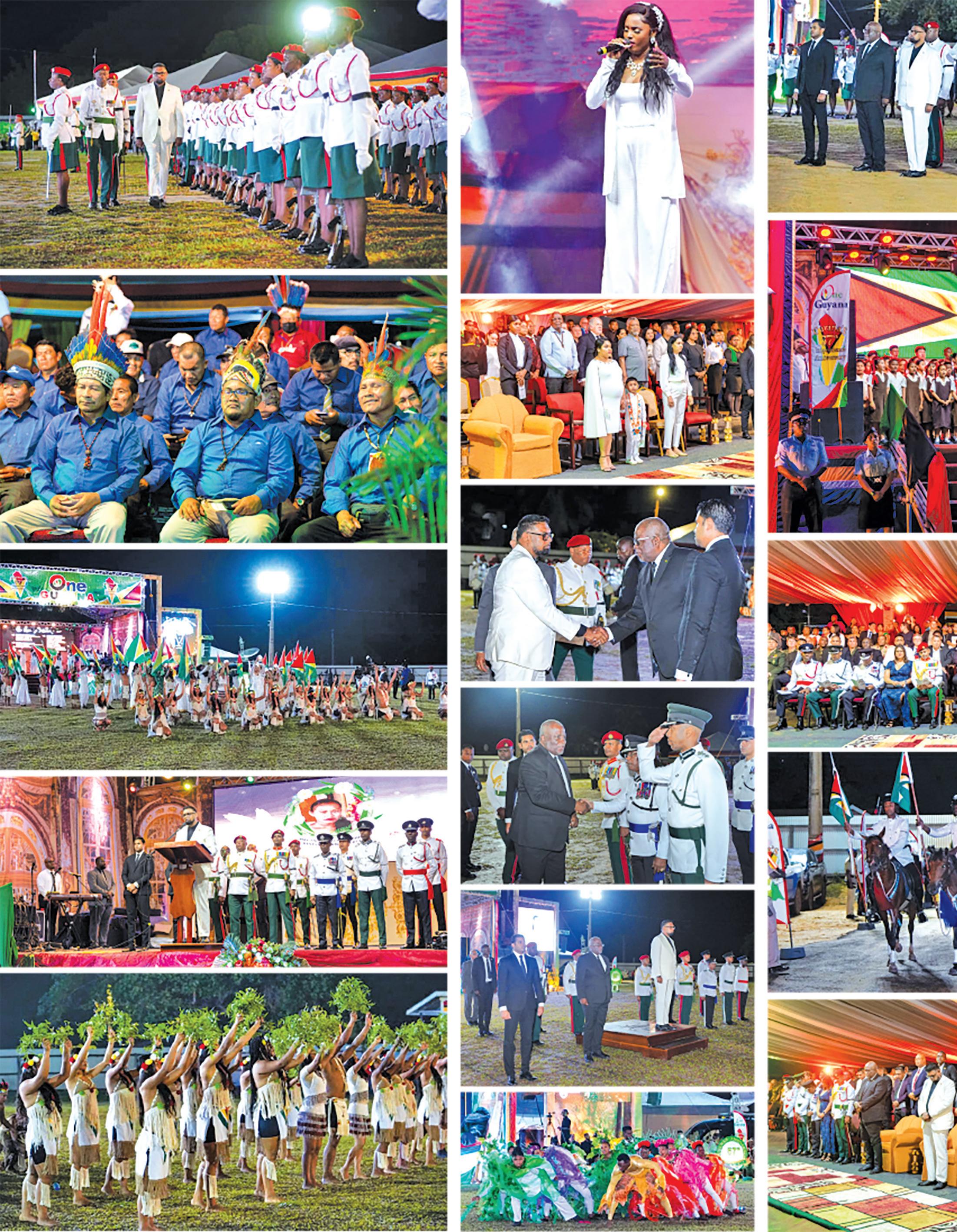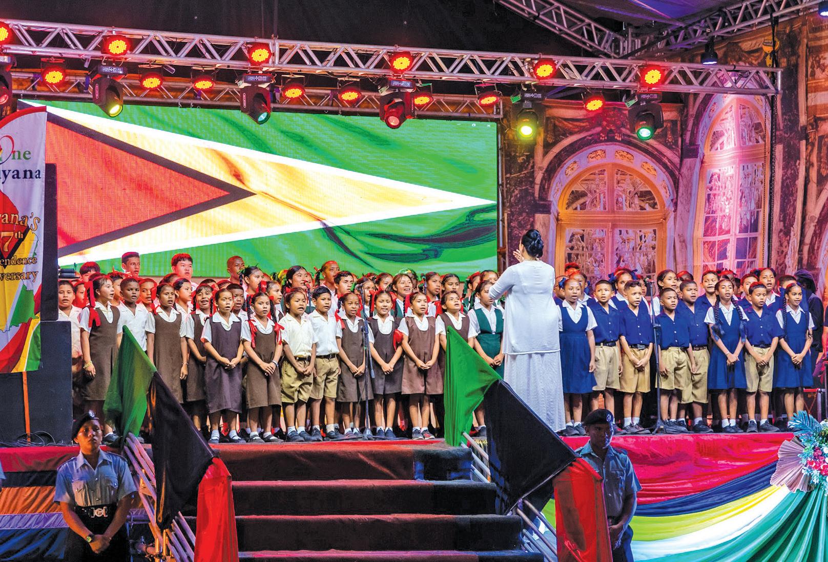 Guyana’s 57th Independence anniversary: The combined children’s choir from St Ignatius Primary and Secondary schools, along with the Arapaima Primary School, performing a national song on Thursday evening in Lethem, Region Nine (Upper Takutu-Upper Essequibo)