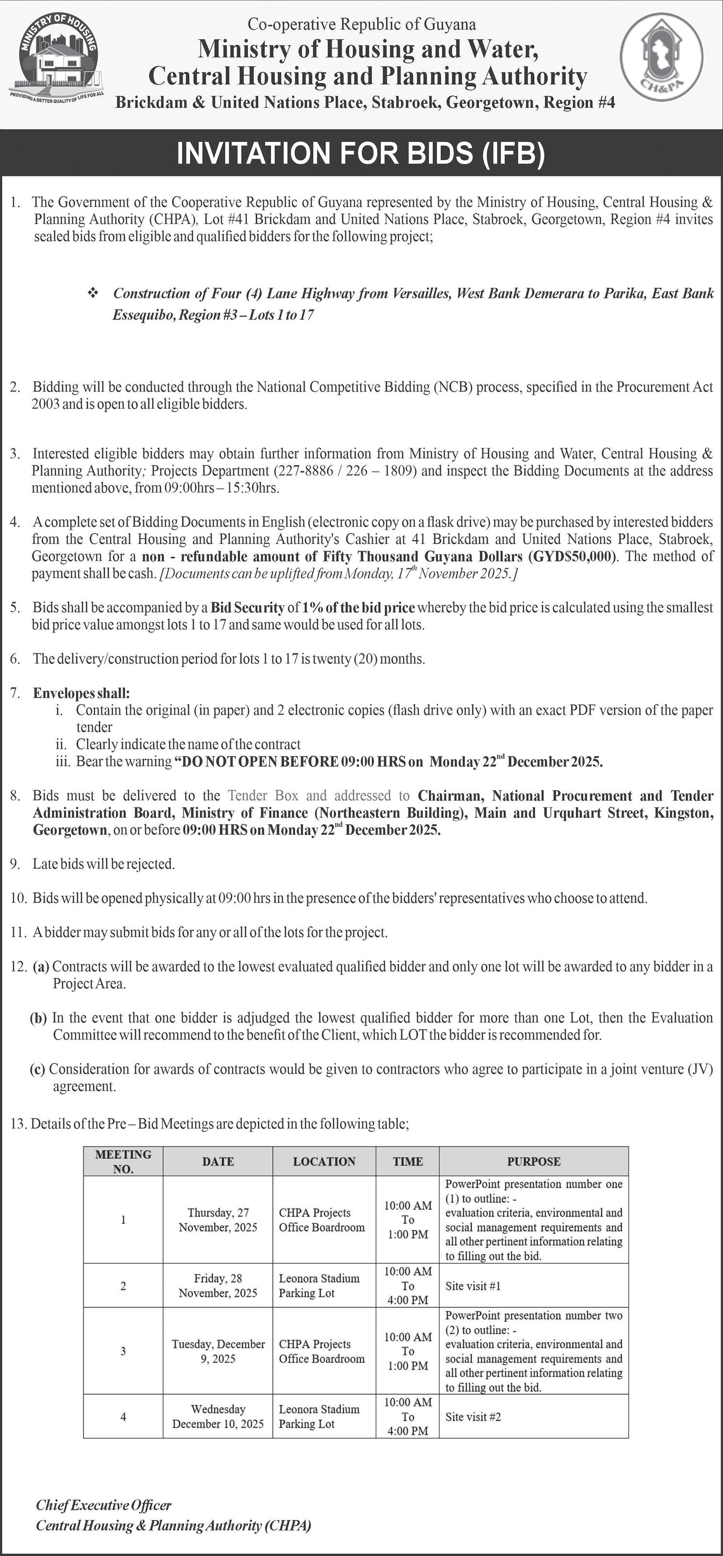 The Berbice Bridge will be closed to vehicular traffic on: Saturday, November 29 –10:55h–12:25h and Sunday, November 30 – 12:05h–13:35h.