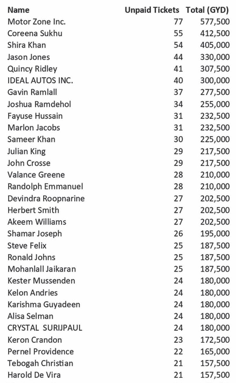 In keeping with President Dr Irfaan Ali’s commitment to improving compliance with traffic regulations, the Guyana Police Force (GPF) on Friday released the names of 95 individuals and companies identified as the top offenders for failing to address tickets issued through the Automated Speed Ticketing System.