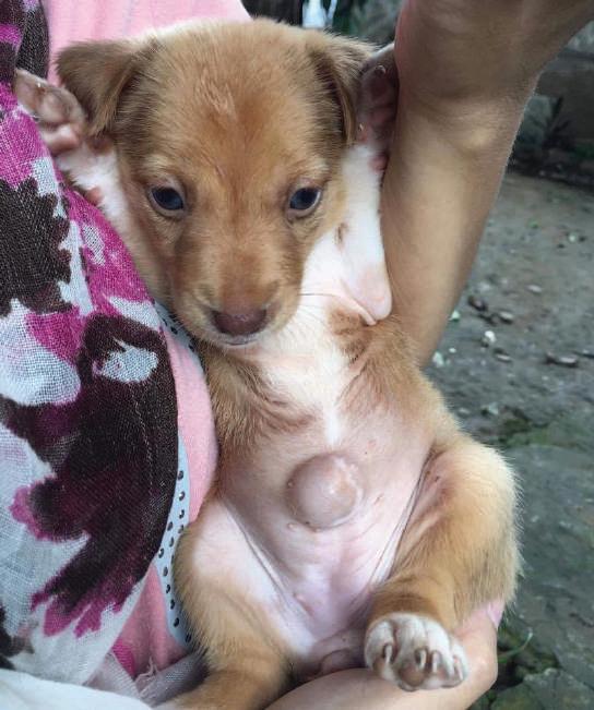 These hernias usually involve the umbilical cord (navel string) which connects the mother dog to the foetus.
