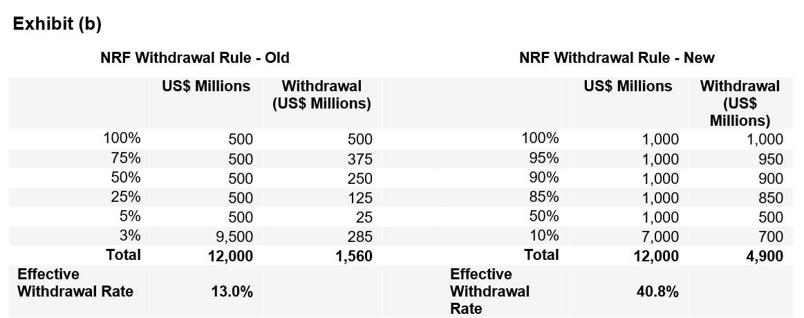 In exhibit (b), under the old NRF withdrawal formula, on a balance of US$12 billion, the maximum withdrawal ceiling is capped at US$1.6 billion, or an effective withdrawal rate of 13%. Whereas, under the amend-