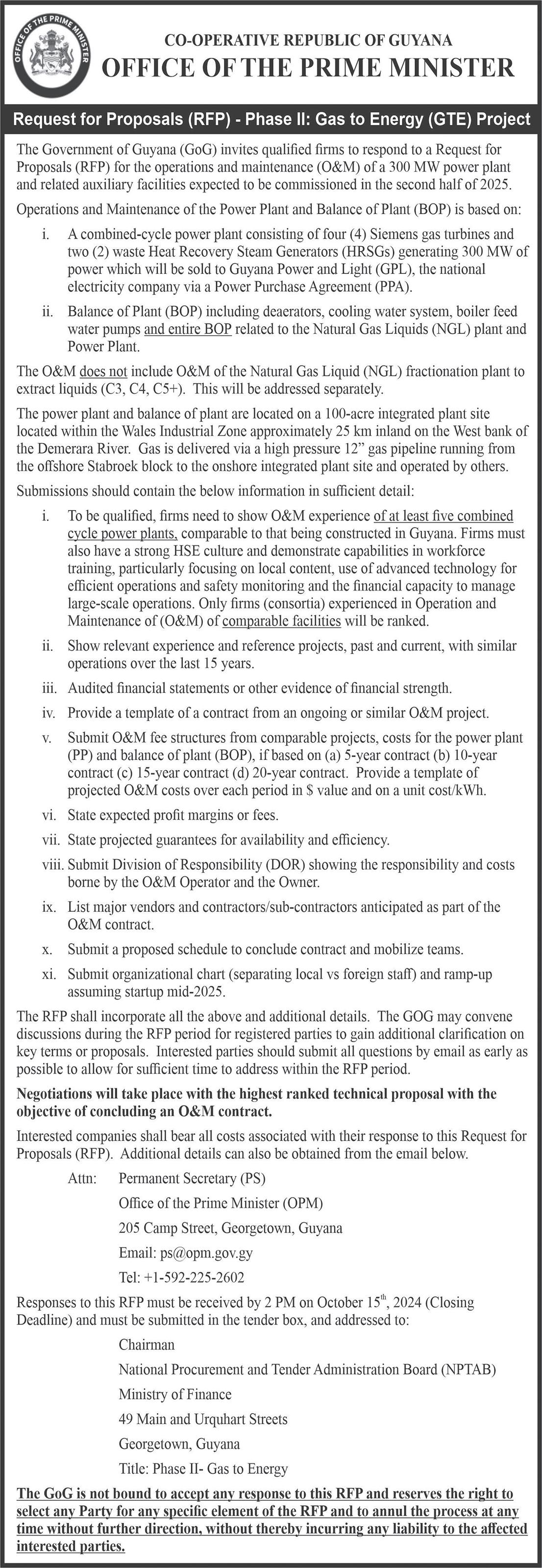 Consequently, qualified firms are now being invited to respond to the Government’s Request for Proposals (RFP) to “design, finance, and operate” Phase Two of the Gas-toEnergy Project on the basis of a 20-to-25-year Power Purchase Agreement (PPA).
