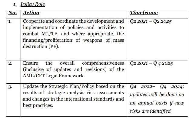 While there are existing AML/CFT laws, more can be done to strengthen or clarify the legislative framework, to better aid Law Enforcement Agencies (LEA) to carry out their duties. The deadline given to complete the updates and revisions to this legal framework is by the fourth quarter of 2025.
