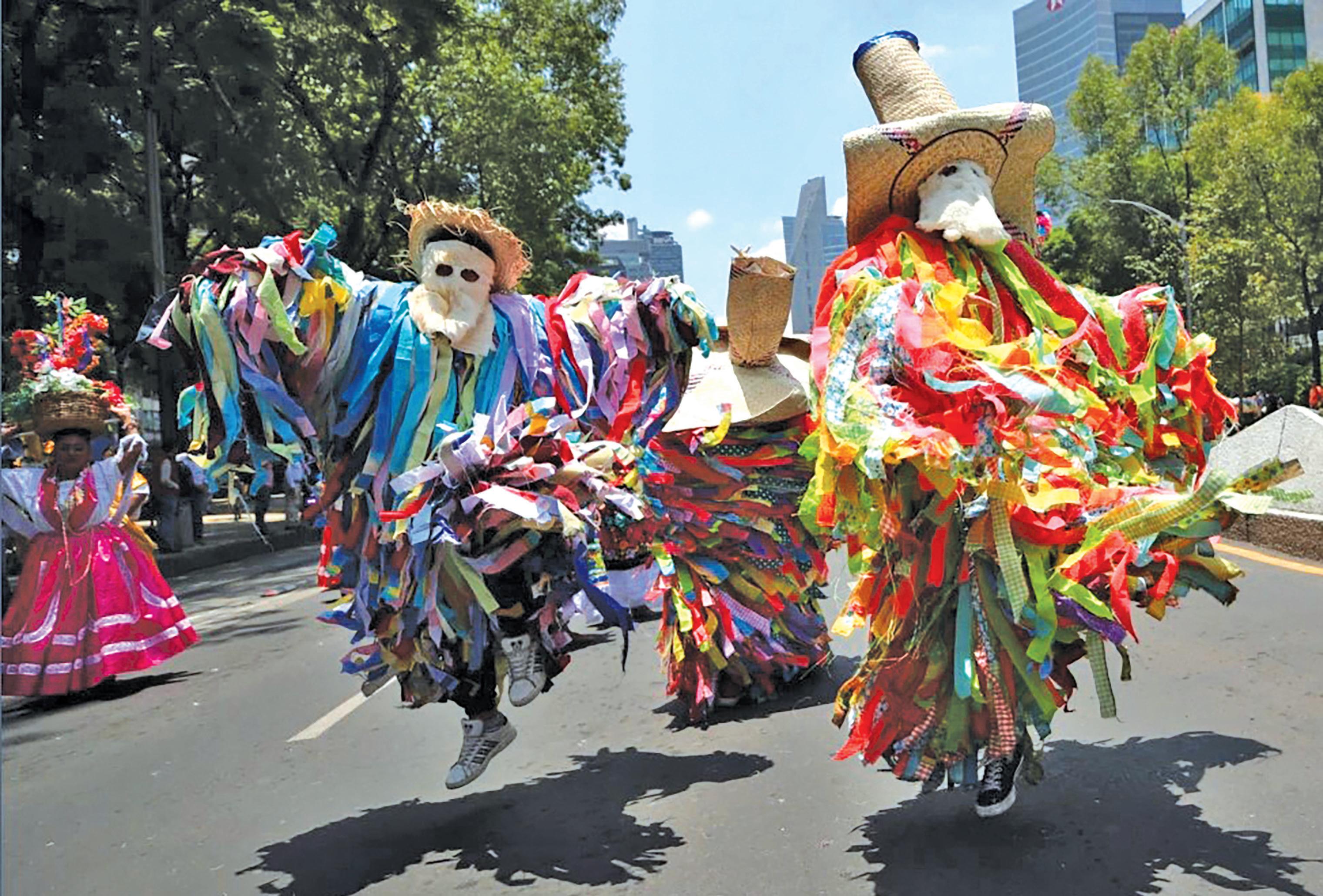 People wearing traditional costumes taking part in a march to mark the International Day of the World's Indigenous Peoples, in Mexico City, Mexico (Reuters)
