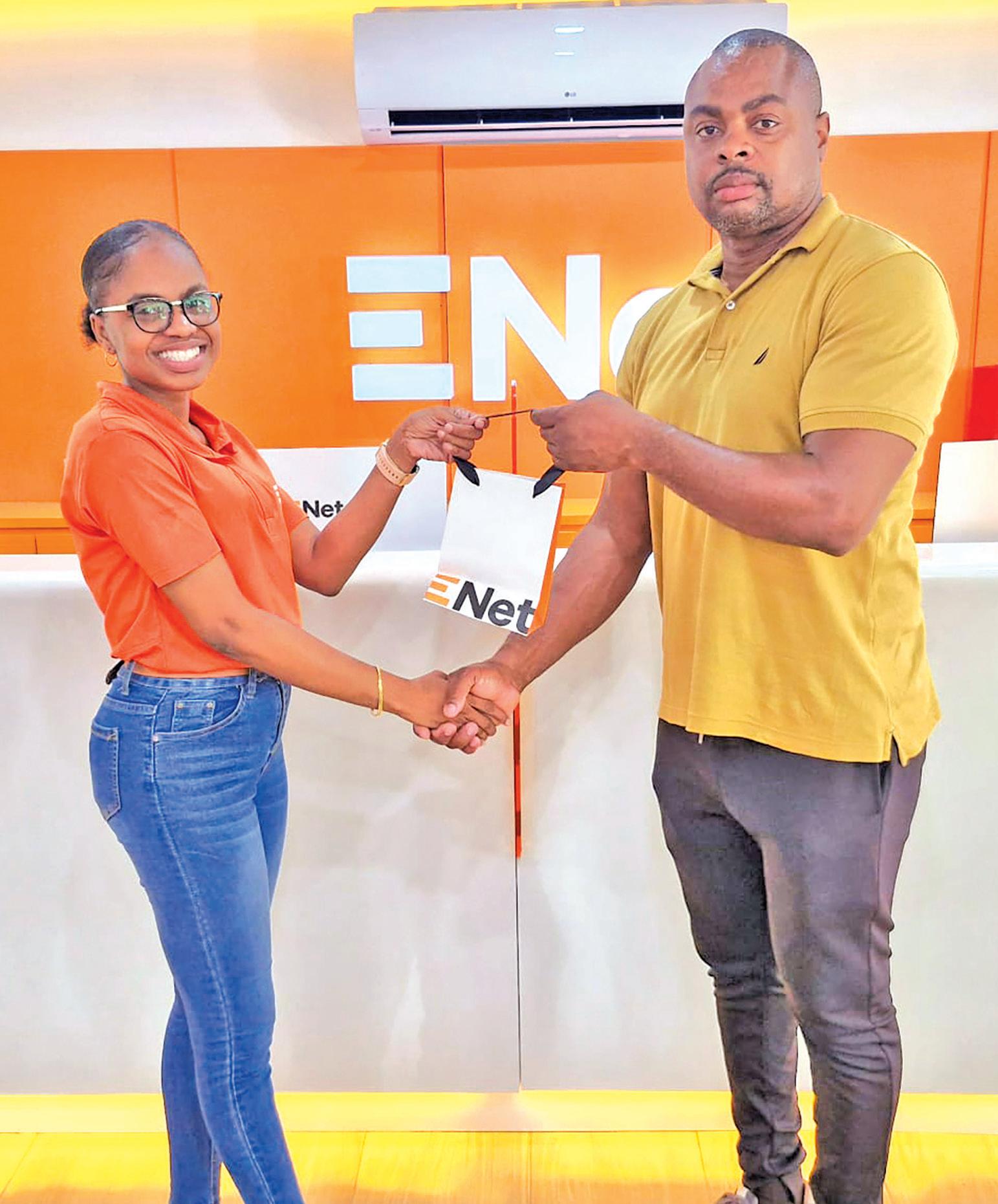 Tiffany Ramdyhan (left) makes the presentation to SMI principal Edison Jefford