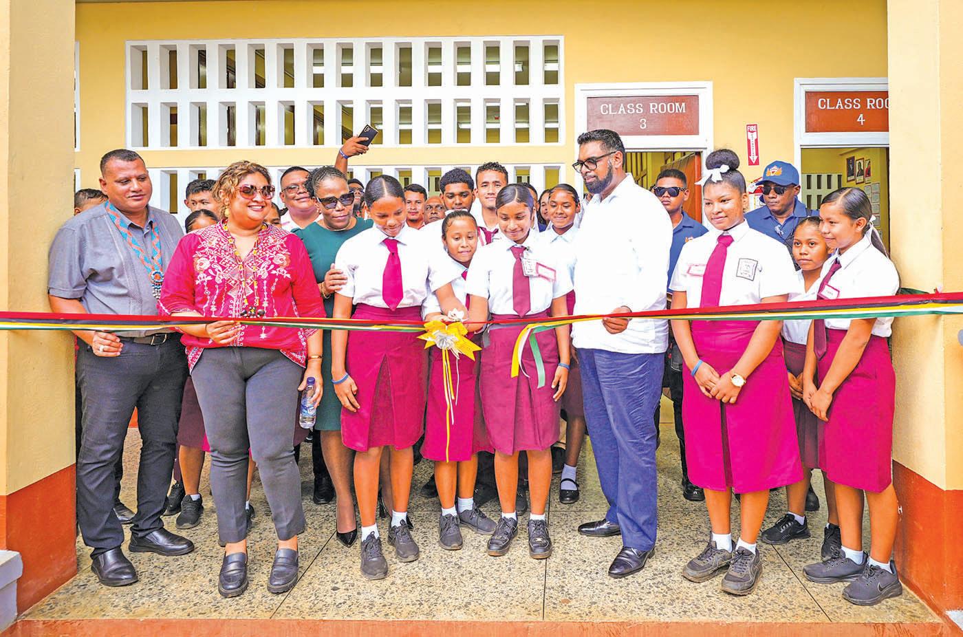 President Dr Irfaan Ali alongside Education Minister Priya Manickchand and students for the ribbon cutting (Office of the President photo)