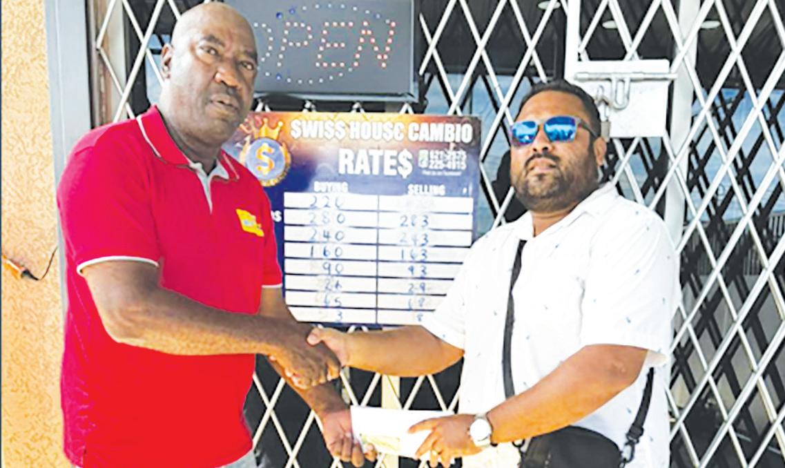 Making the trek to receive the sponsorship cheque from Swiss House Cambio was Frank "English" Parris, who has been the pioneer of futsal in Guyana and a long-serving member of the K&S Organisation.