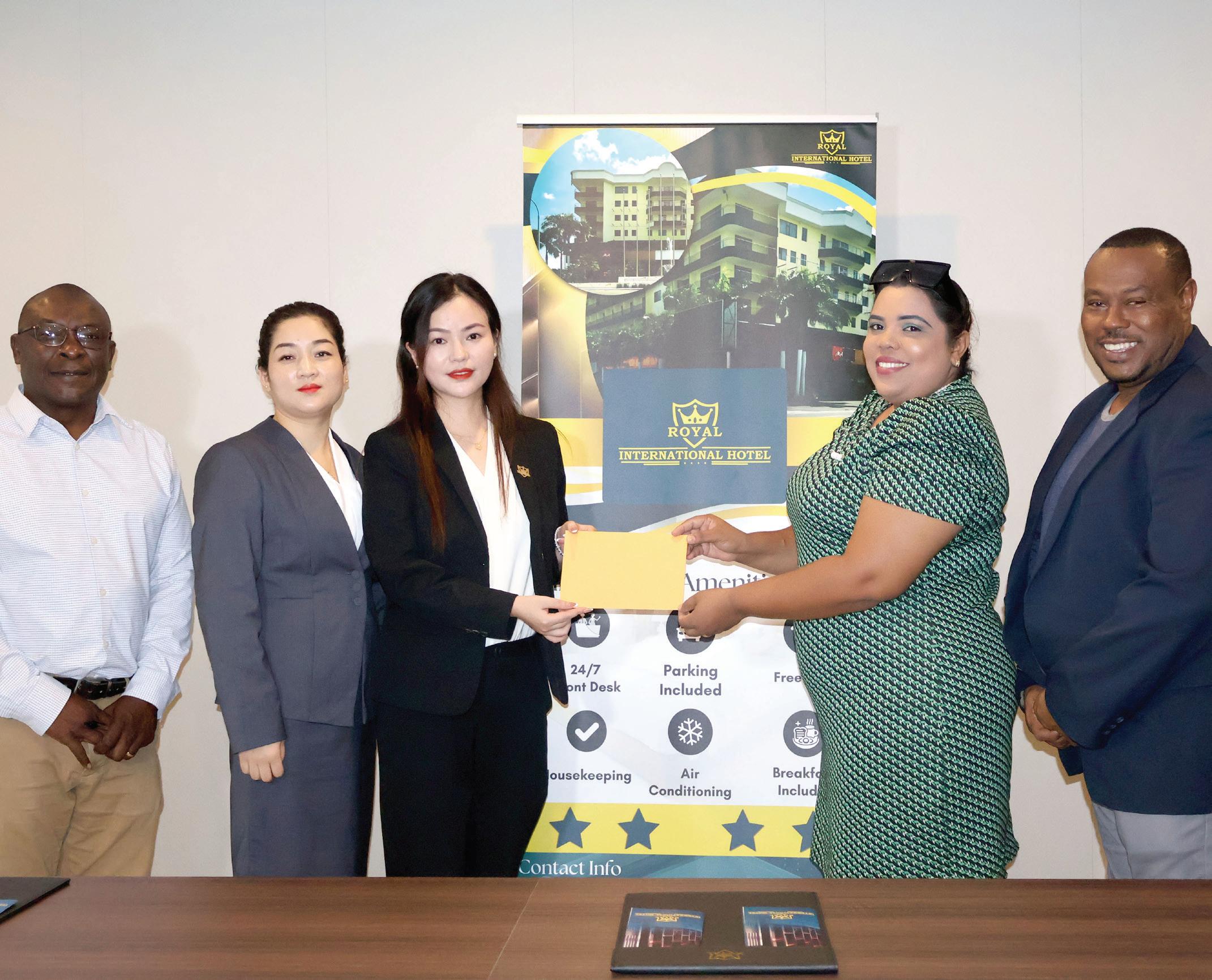 Royal International Hotel’s Zheng Sai Li making a presentation to Petra’s Nareeza Latif-Boston in the presence of Troy Mendonca (R) and Troy Peters, both of Petra Organisation
