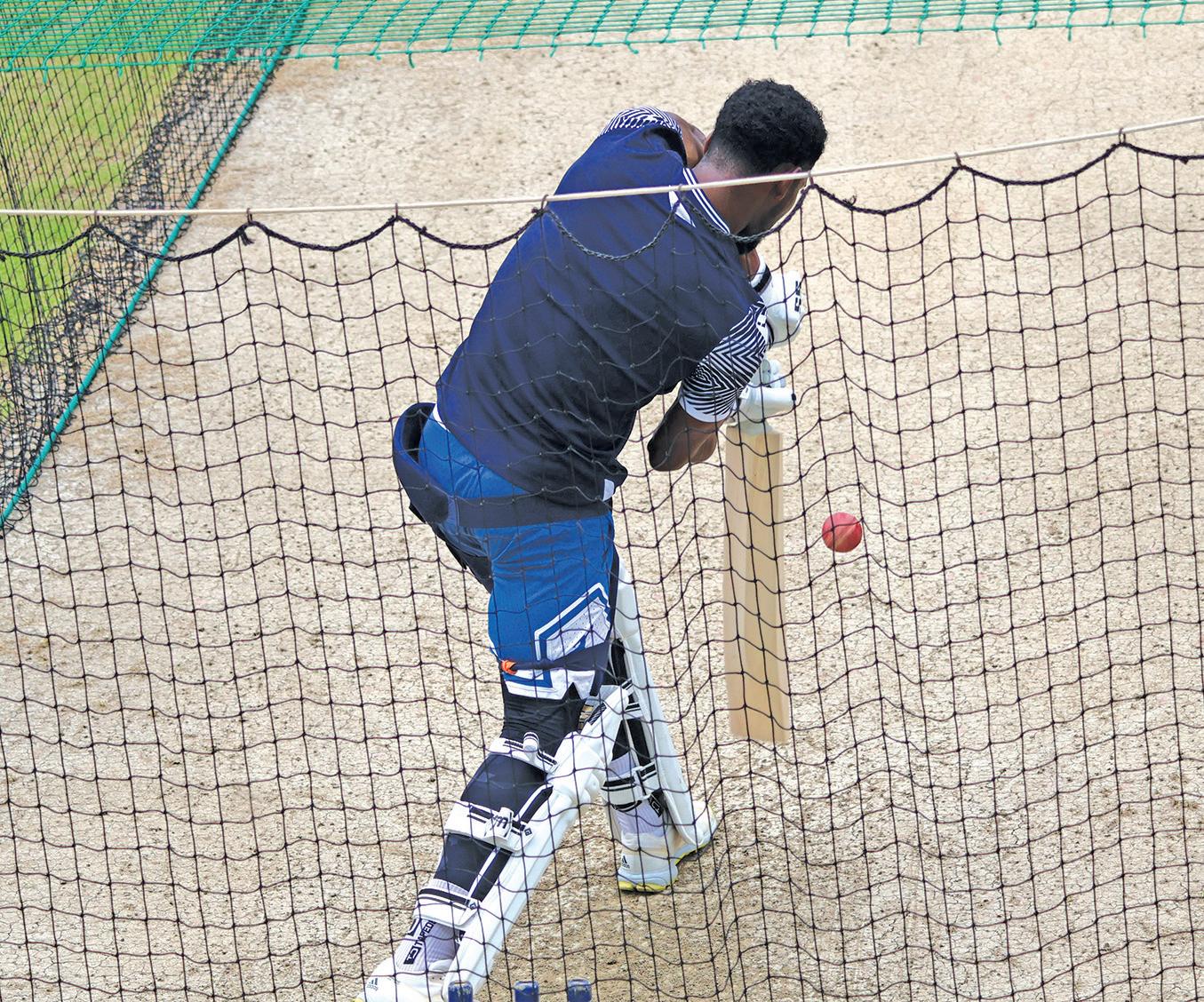GHE Skipper Tevin Imlach receiving a few deliveries in the nets from Guyanese legend Ramnaresh Sarwan