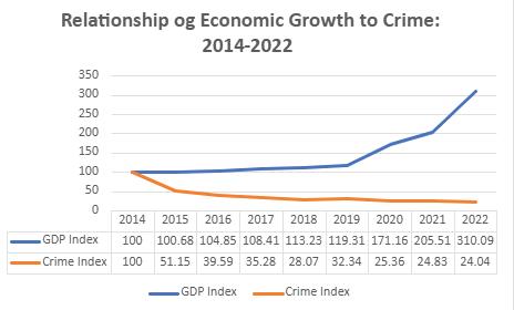 I therefore sought to explore if this theory could apply to Guyana. An analysis covering the period 2014 to 2022 shows that expanding economic development has not led to an increase in criminality. As Guyana advances in its development thrust, the incidents of serious crimes reported to the Police have been declining after 2014, while the GDP has been expanding rapidly from 2019, partly because of oil production and revenues. The chart shows the relationship between economic development as measured by GDP and crime. An index for crime and GDP was created using 2014 as the base to allow for comparison.