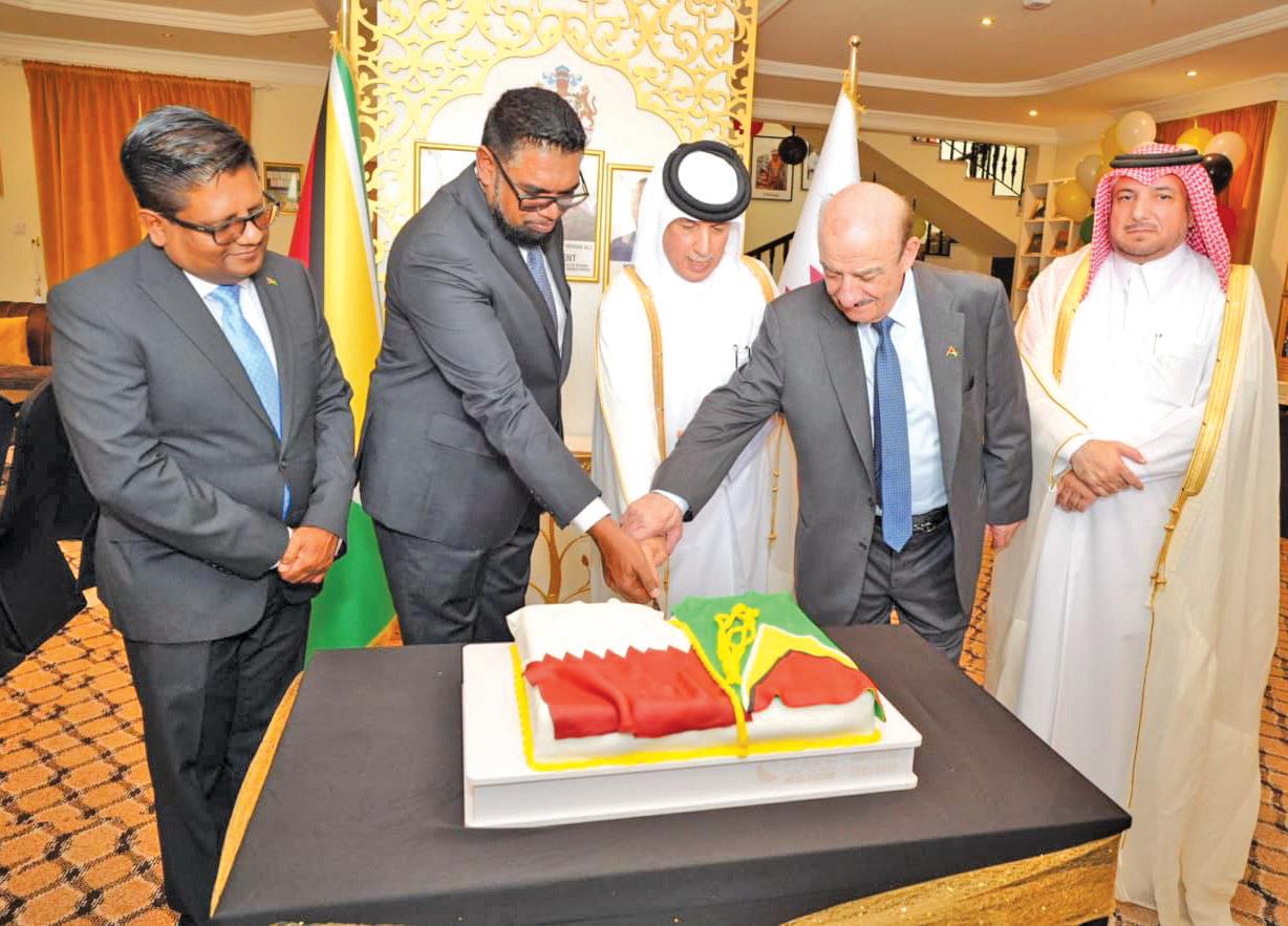 President Dr Irfaan Ali and Qatar’s Minister of State for Foreign Affairs Sultan bin Saad al-Muraikhi cut a cake to mark the opening of Guyana’s Embassy in Qatar. Also in photo are Guyana’s Finance Minister, Dr Ashni Singh and George Halak (Qatar News Agency photo)