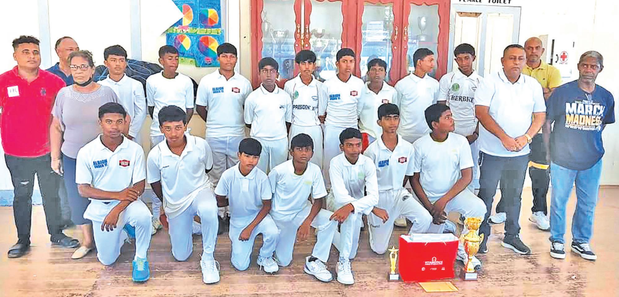 National Under-13 batsman Nathaniel Ramsammy was then stumped for 05 off the bowling of Nitendra Parchae when the score was at 41 for 2. Sewnauth was trapped LBW by D. Sammaroo with the score at 69 for 3, but levelheaded batting by Devin Lalbehari, who scored 27 not out with two sweetly timed boundaries, and Man of the Finals Feaz Baksh, who produced eight not out, led Albion to a crushing seven-wicket victory which allowed them to retain the Minister Zulfikar Mustapha Berbice Under-15 title.