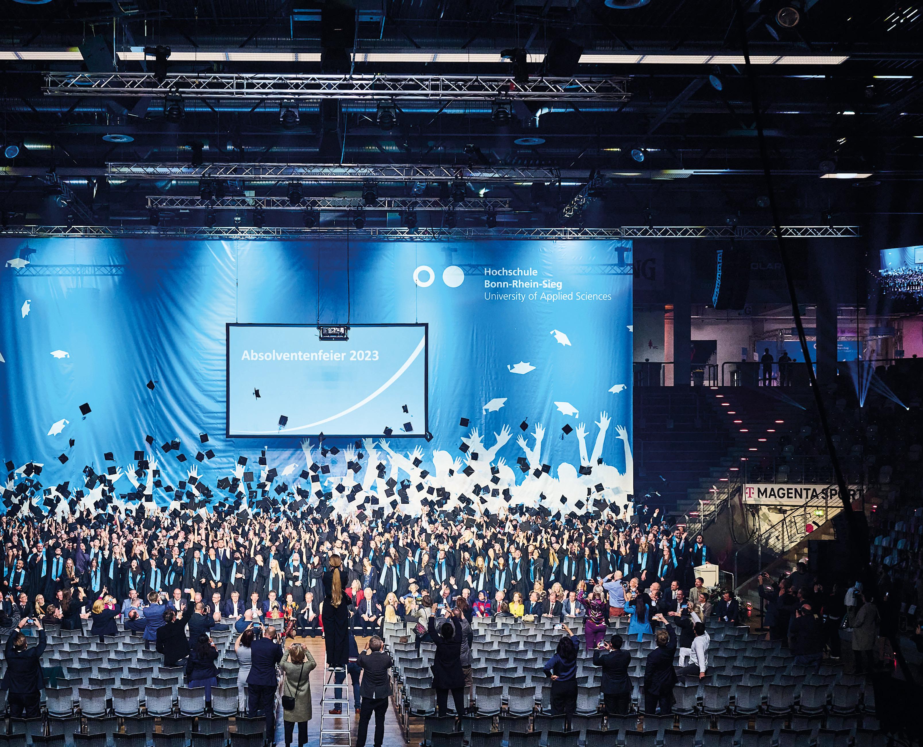 At the end of the academic year, it is time for the hat toss – and that is exactly what around 600 graduates of Hochschule BonnRhein-Sieg – University of Applied Sciences did on 21 October 2023 at the Telekom Dome in Bonn. Years of intensively studying of mathematics, computer science and technical knowledge, natural sciences and social policy came to a crowning conclusion in the festively decorated Telekom Dome. A total of 3,000 guests filled the arena. In addition to the graduates, their families and friends were also present, as well as prominent figures from politics, business, society and the scientific community. The guest speaker was Thomas Ogilvie, Chief Human Resources Officer at Deutsche Post DHL.