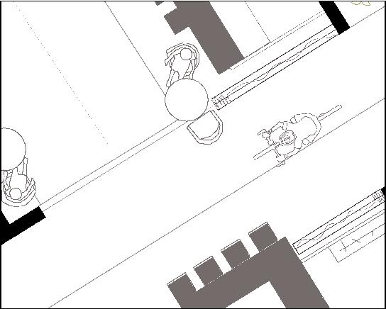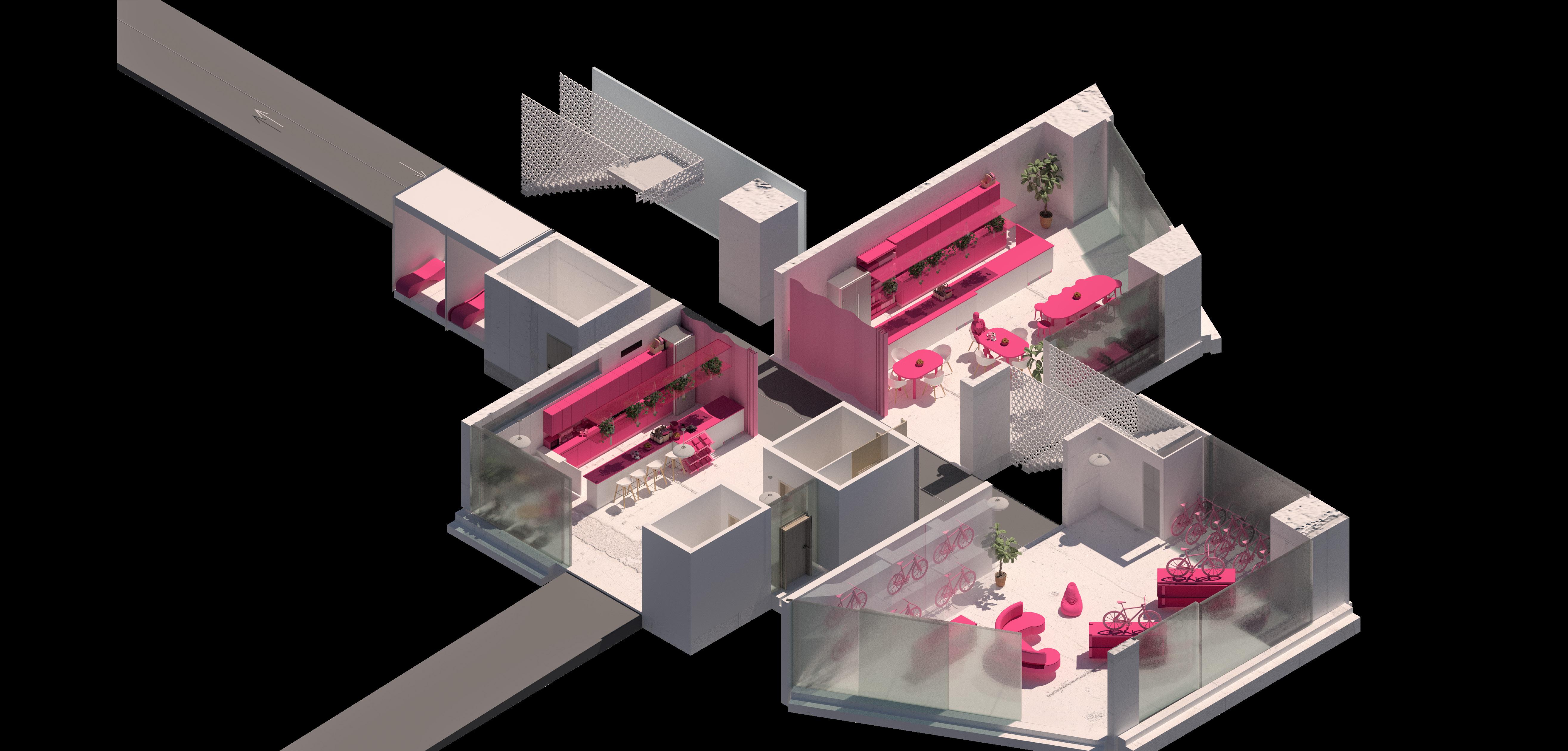 +CYCLISTS DISAPPEARS AND APPEARS THROUGH THE CAFE BY BREAKING THE CAFE INTO SEGMENTS, BLENDING INTERACTION BETWEEN OUTSIDE AND INSIDE