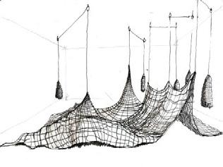 USING MATERIALS SUCH AS POLYPROPYLENE. USING MESH-LIKE MATERIALS TO LAYER AND CREATE A BLUR BETWEEN SPACES. THIS ALLOWS TO BLUR BETWEEN THE LANDSCAPE INTO THE INSIDE OF THE CAFE , CREATING AN ILLUSORY AND PLAYFUL WORK.