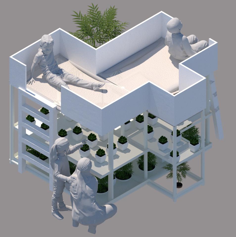 A PLAYFUL SPACE FOR CHILDREN TO ENGAGE, LEARN AND PLANT. EVERY LITTLE CUBOID EDGE GOES ABOUT AS A LITTLE STRUCTURE FOR A COUPLE OF PLANTS. WITH A MINIMAL SLENDER STRUCTURE.