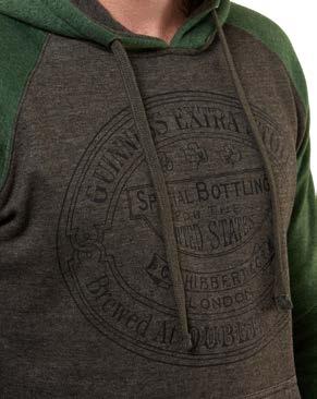65% Cotton 35% Polyester fleece • 280g/m2 • Hoodie lining 100% Cotton single jersey 180g/m2 • Metal eyelets and lace up hoodie • Embroidery detail on hood trim • Arthur Guinness signature embroidery on the back • Full Guinness logo on woven label stitched near waist line hem.