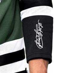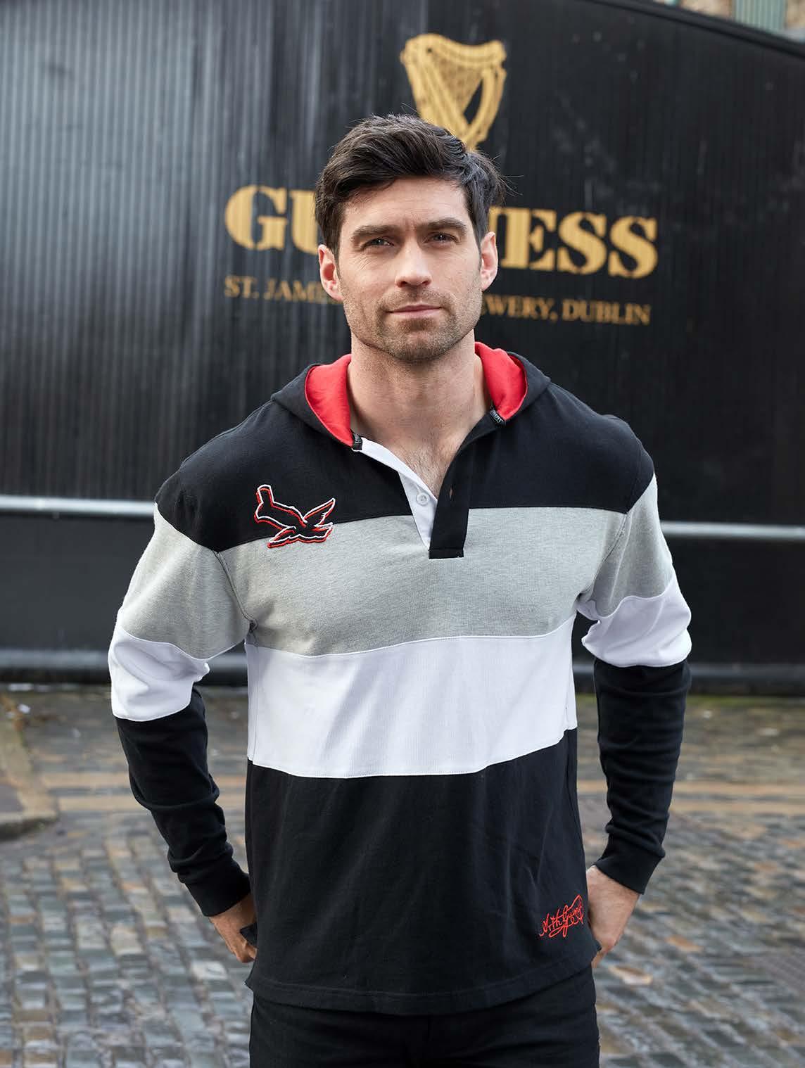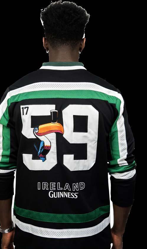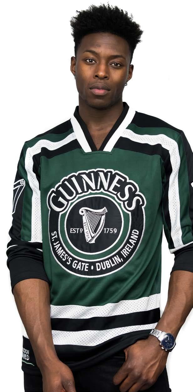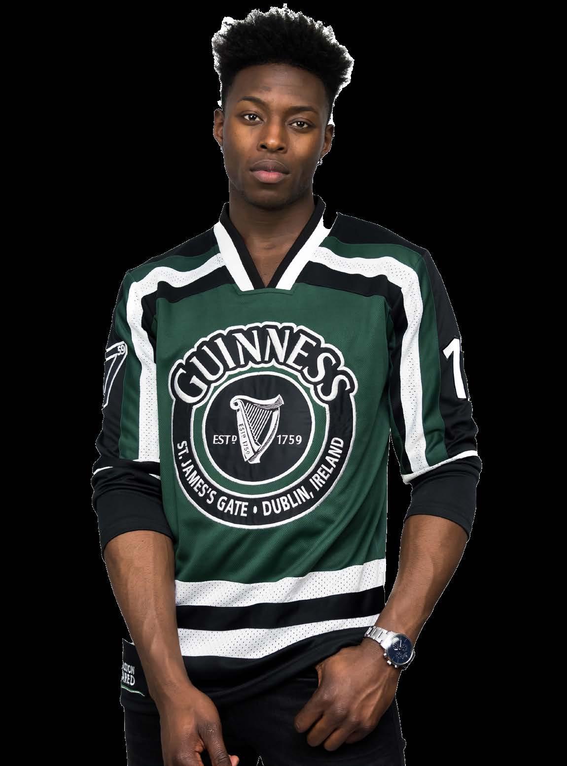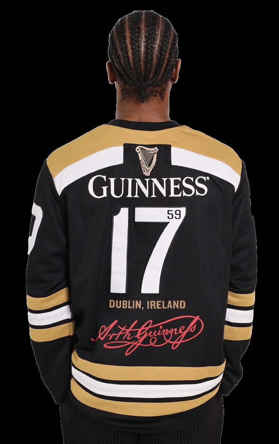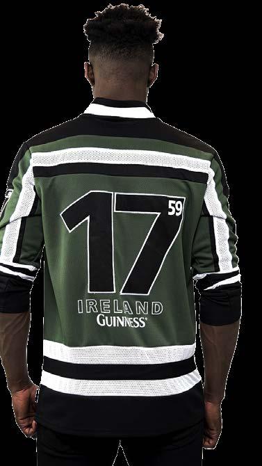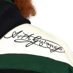 • White piping on sleeve • White double collar with two buttons • Arthur Guinness’ classic signature on sleeve • Cut and sew white panel with Guinness detailed embroidery.