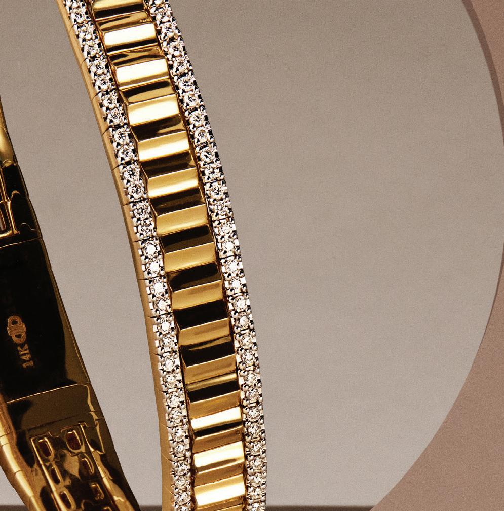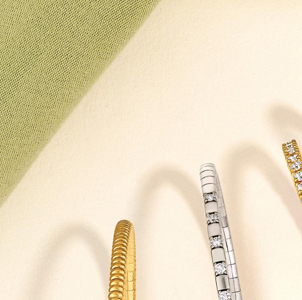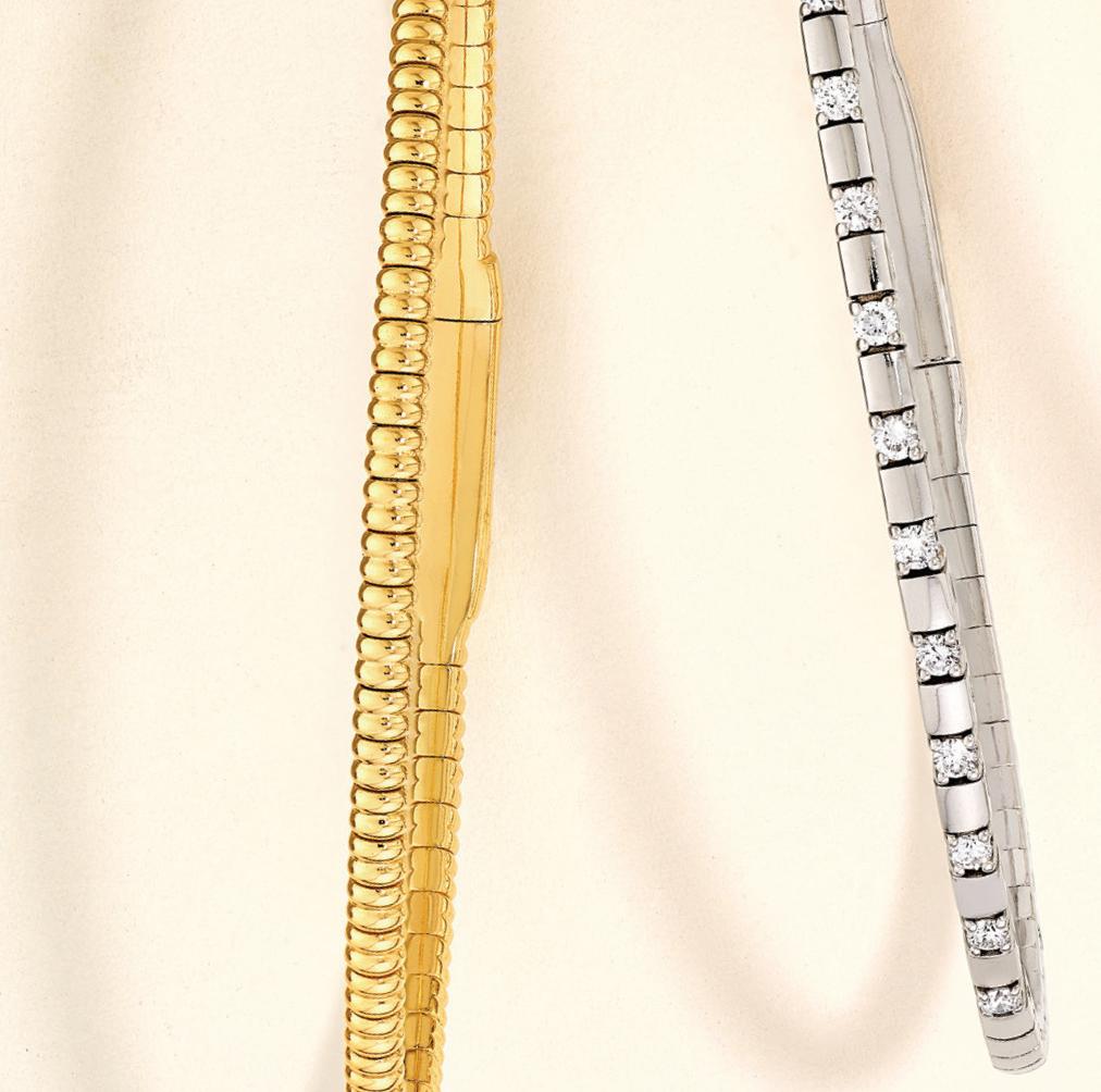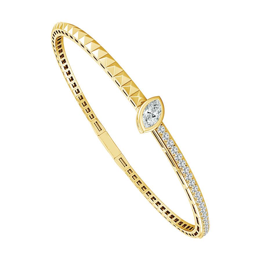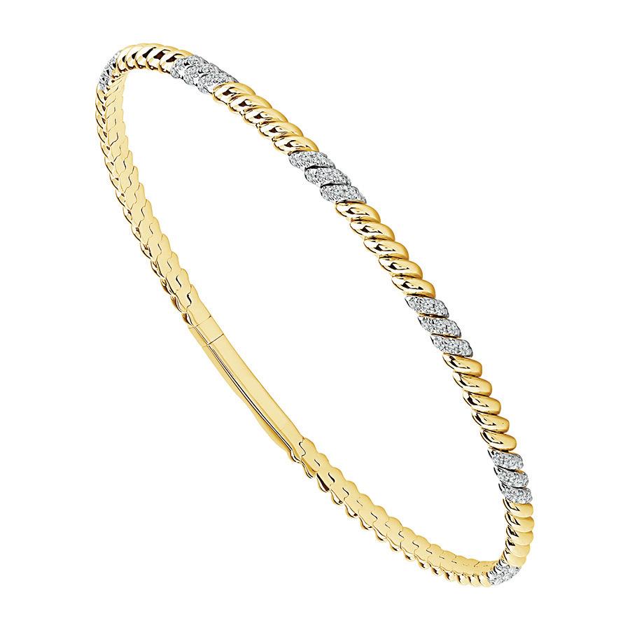 Elevate your showcase: a yellow gold Flexie bangle featuring 72 round stones totaling 0.33 ct. Flexible design built for daily wear, effortless stacking, and standout case presence that draws shoppers.
