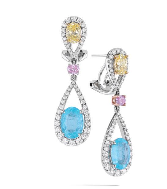 A masterful one-of-a-kind creation, these drop earrings feature radiant yellow diamonds, brilliant white diamonds, and vivid Paraiba tourmalines, artfully set in 18k tri-tone gold to exalt each stone’s rare beauty. Prince on request.