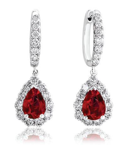 Exquisite pear-shape ruby drop earrings set in 18K white gold, adorned with brilliant round diamonds throughout. The deep red rubies radiate passion, while the sparkling diamonds add timeless elegance. Perfect for evening glamour or cherished celebrations.