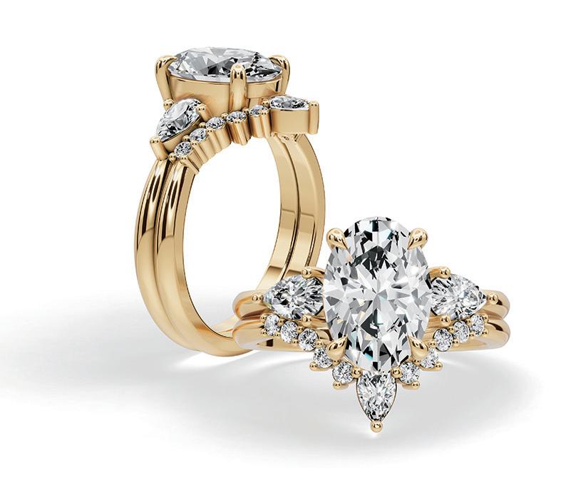 Elegant 14KYG Bridal-Set featuring a dazzling 2Ct Oval center enhanced by pear shaped sides and beautiful flush-fit band with rounds/pear-shaped diamonds, perfect to showcase eternal love. Center not included.