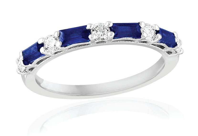 Classic halfway band crafted in 14K white gold, showcasing emerald cut sapphires alternating with brilliant round diamonds. This refined design balances timeless sparkle with rich blue hues, creating a sophisticated piece perfect for stacking. A versatile ring that seamlessly blends modern style with classic luxury.