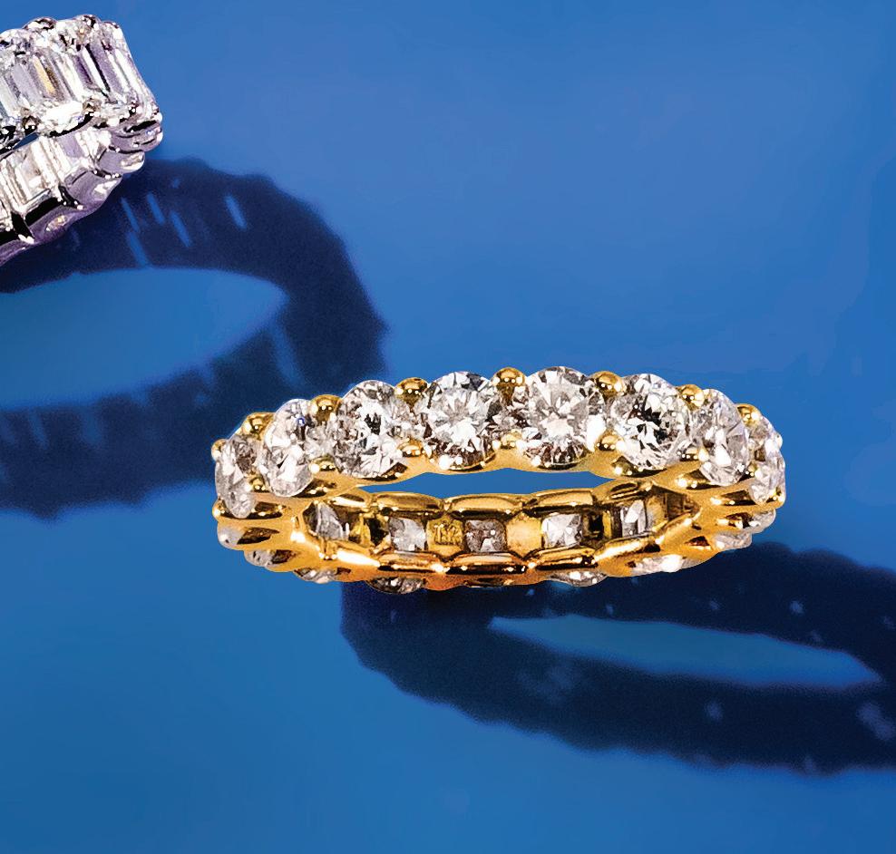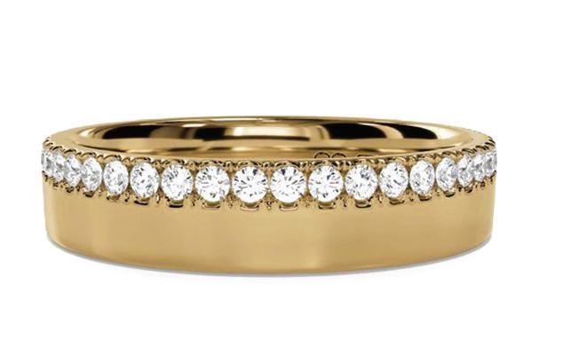 Made in 14K yellow gold, this band features a row of brilliant-cut diamonds, loved for its versatility as both a wedding band and everyday luxury piece. www.costarimports.com