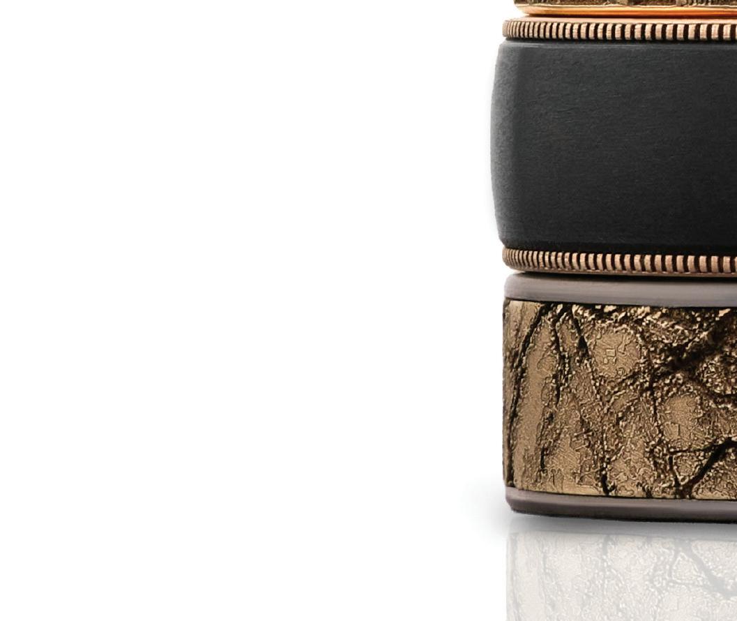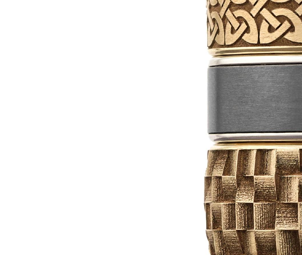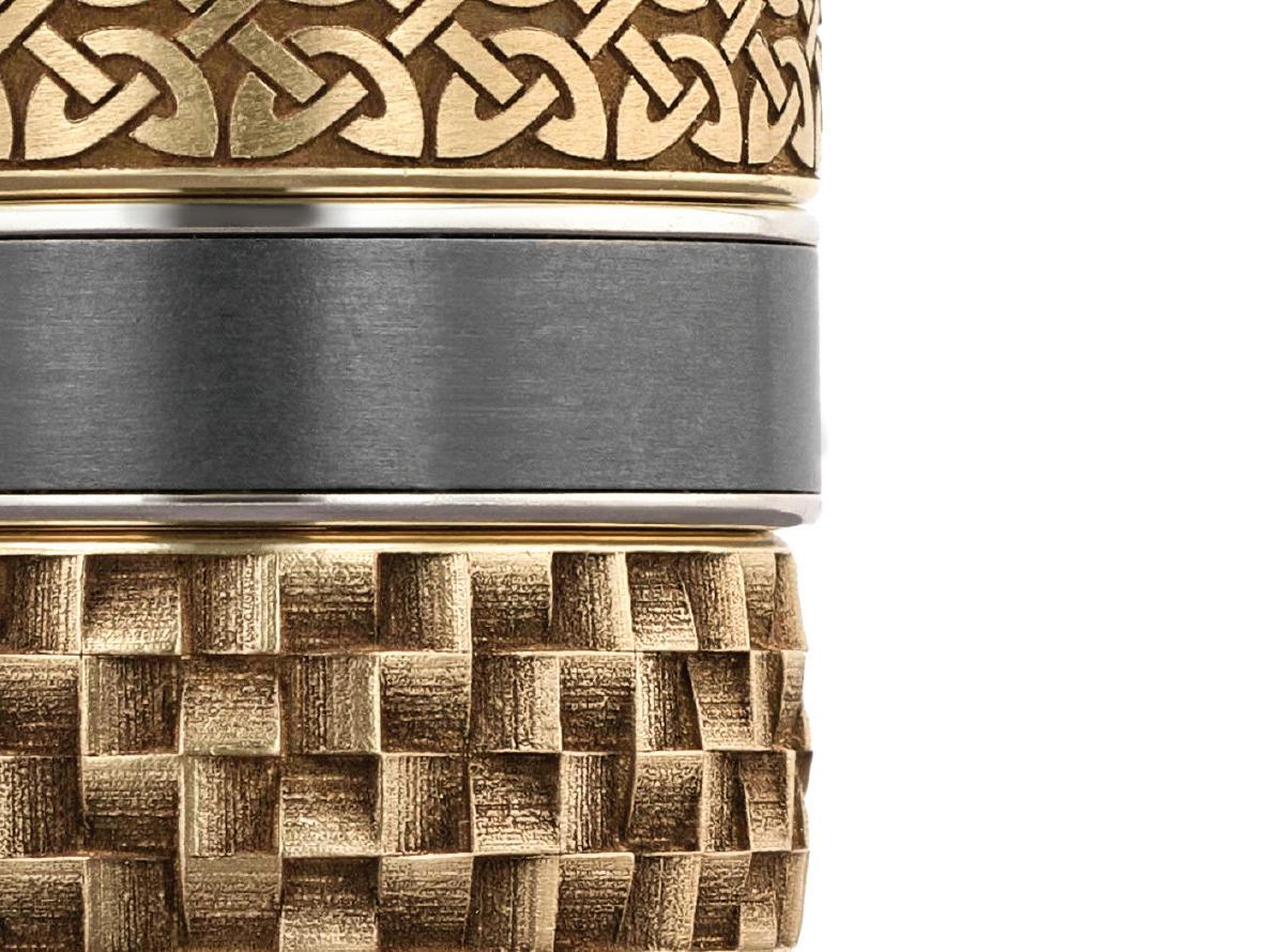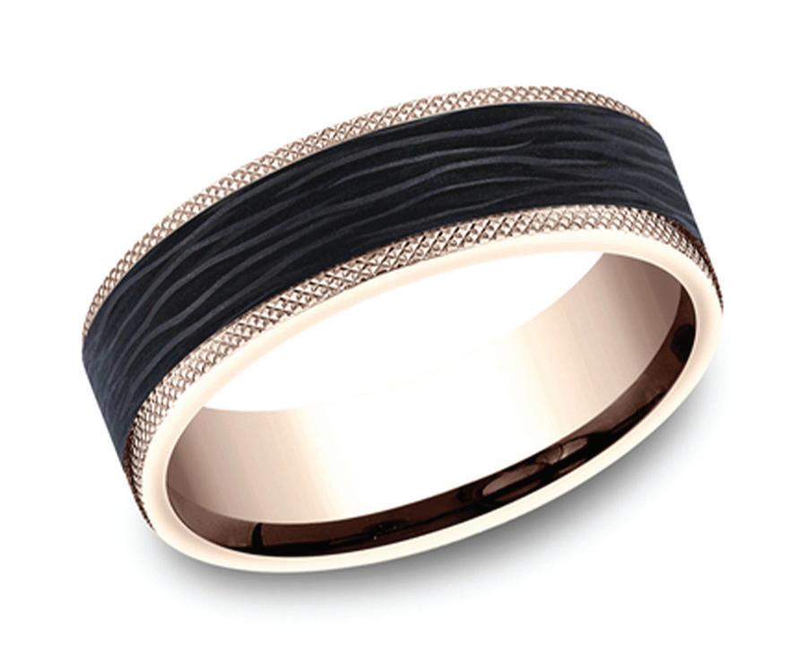 The Obsidian is part of a new line of rings, Raven by Benchmark. It features a forged carbon fiber center with 14k Gold knurled edges. www.benchmarkrings.com