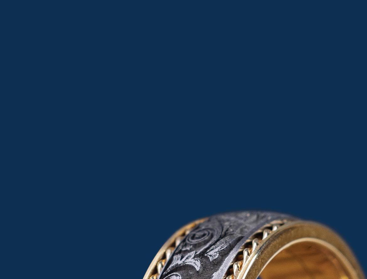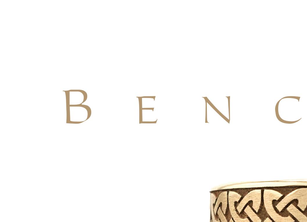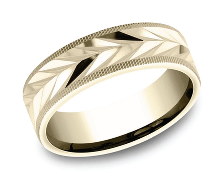 The Emmer is a new take on one of our best-selling rings, The Primor. This 14k Gold band features milgrain edges and a wheat designed center www.benchmarkrings.com
