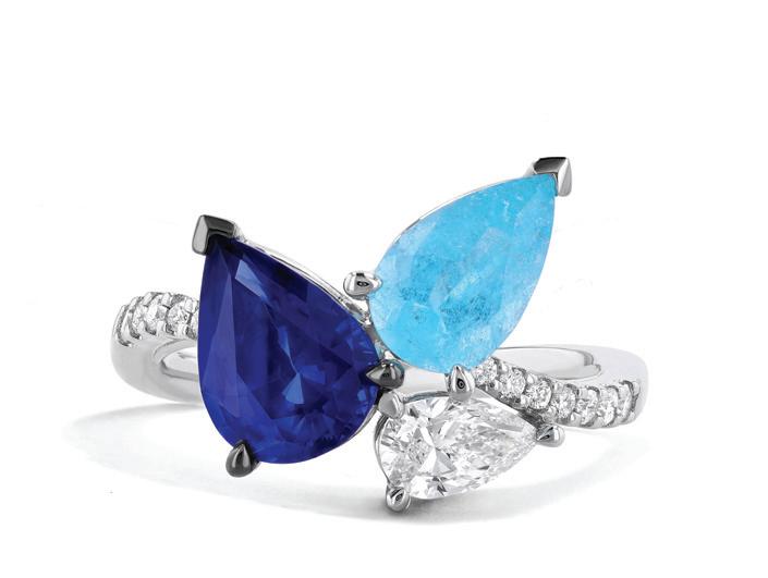 A bespoke statement of modern elegance, this asymmetrical 18k white gold ring unites a vivid sapphire, rare Paraiba tourmaline, and brilliant diamonds, creating a harmonious play of color and form. Prince on request. www.ashicouture.com MSRP $3669