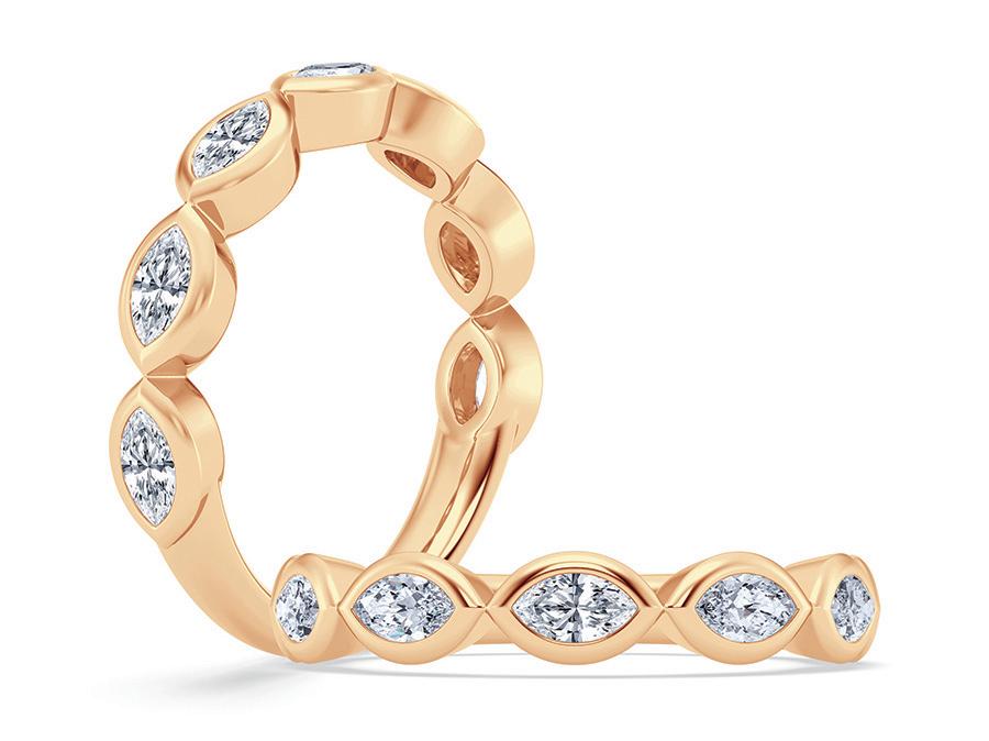 Classic 14K YG band featuring 7 marquise shaped bezel set diamonds, perfect for everyday wear or special occasions, can be stacked with our bands with Emeralds, Ovals, Pears.