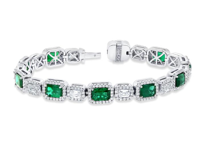 Featured in alternating rectangular links are 10 rectangular faceted cut corner emeralds with a combined weight of 9.22 carats. In addition are 10 rectangular emerald cut diamonds weighing 3.15 carats total and surrounding these are 358 round brilliant cut diamonds weighing 2.43 carats. Handcrafted in platinum.