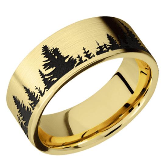 An 8 mm wide flat profile 14K yellow gold band ring with a laser carved black cerakote inlay trees pattern.