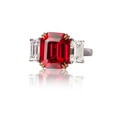 Exquisite 6.16ct EC Vivid Red Thai Ruby (H) surrounded by two EC diamonds 2.04cts. classically mounted in a three stone Plati num/18K and Diamond Ring