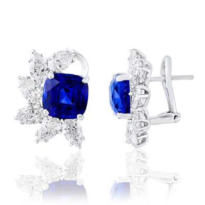 A unique pair of Earrings, set with two vivid blue Cushion-Cut Sapphires. These breath taking 9.06 carat of Sapphires are compli mented by flawless Pear Shape Diamonds maximizing it’s utmost magnificence and providing that remarkable Wow factor. Style# E3000-S8 MSRP:120,000