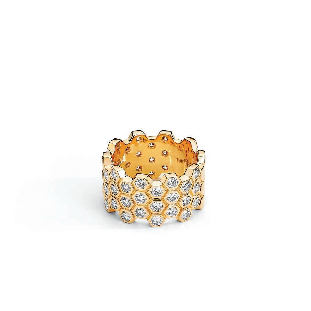 Warm 18K yellow gold spokes complement the graduated sizes of champagne diamonds wrapped in modern, hexagonal settings.