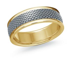The Mason is a 7.5mm, comfort fit band featuring thin Tantalum edges and a 14K Gold stacked brick design center.