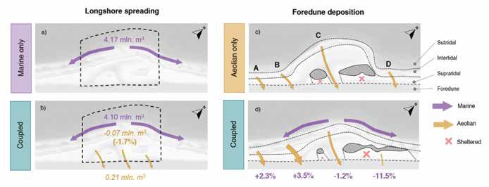 Als je de uitkomsten van dit gekoppelde model vergelijkt met die van de losstaande modellen, dan zie je dat windgedreven zandtransport naar het voorduin, zand onttrekt aan het mariene domein. Als gevolg hiervan neemt de herverdeling van zand langs de kust door mariene processen af met 70.000 m3 over een periode van 5 jaar, wat neerkomt op 1,7 procent van de totale mariene verspreiding. Tegelijk geven door de zee veroorzaakte afzetting en erosie een nieuwe vorm aan strand en duinen, die op zijn beurt weer de mogelijkheden voor windtransport beïnvloedt. Het meenemen van deze mariene processen in het gekoppelde model resulteerde op de zuidflank van de Zandmotor in 5 jaar tijd in een toename van de duinaangroei van 1,3 procent naar 6,7 procent. Op de noordelijke flank, waar de zich ontwikkelende lagune en het getijdekanaal meer beschutting bieden aan het strand, nam de voorspelde voorduinafzetting juist af tot 11,5 procent.