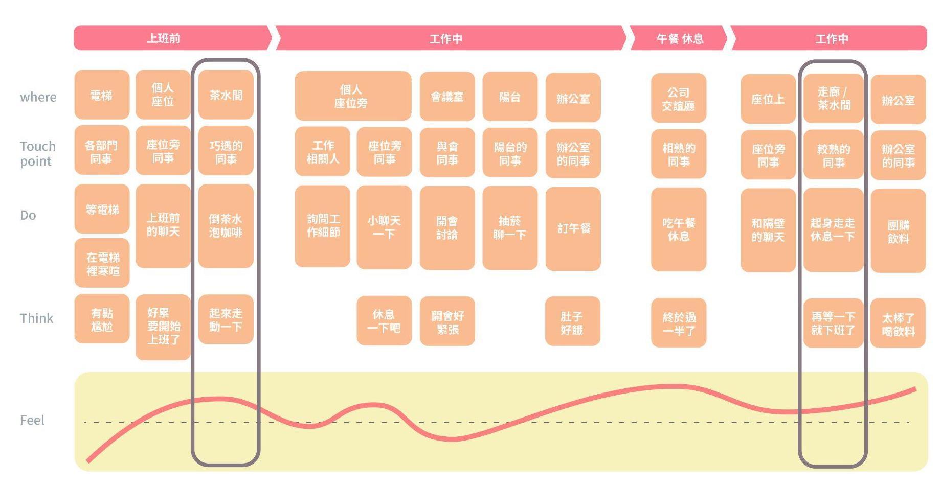 為了解真實職場場域,本團隊透過訪談與場域觀察,將上班族的一 日生活,製作成使用者經驗旅程圖(User Journey Map),以盤點上班族工 作的行為模式。發現到,工作間的休息是所有工作者的共同需求(如圖 2),當上班族工作到一階段時,會起身走動、放鬆一下,前往茶水間泡杯 咖啡,而當偶遇同事時,也能透過聊天來與他人互動,並藉此得到放鬆 感。因此本設計團隊抓取工作時的小憩時刻,來作為設計切入點。