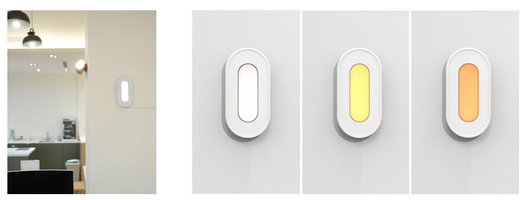 提示燈的設計概念乃是呈現休憩室的互動狀況與人群氣氛,透過在休 憩事外安裝的紅外線感應裝飾,以紀錄進出人數,再經由燈光的閃爍、色 澤變化,使辦公室的上班族能夠了解此刻茶水間的情況(如圖 5 左),並決