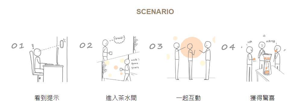 現今快速的工作步調下,間接影響上班族與同事們的相處機會減少, 除了同單位的同事可有較多的相處時間,上班族與其他跨部同事在日常 中,除了偶遇鮮少有互動的時機。觀察到該職場現象,因此本設計團隊經 由辦公室牆上的提示燈,進行吸引與匯集的步驟,創造人際的接觸機會。 使平時難以相遇的工作者,能有機會進一步接觸。過程中也使用紅外型偵 測來統計人數,使得休憩室的互動資訊能立即串接到辦公室。