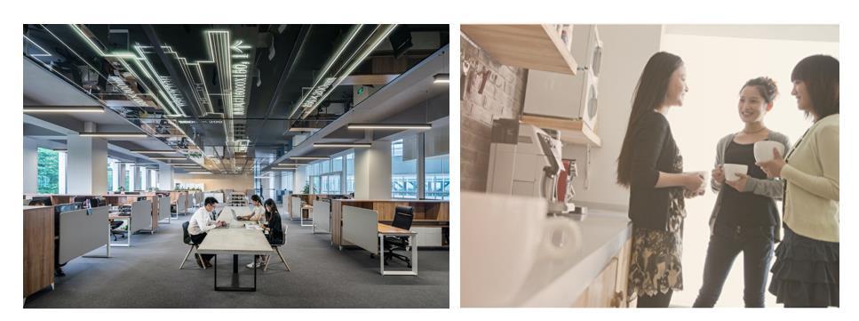 此外,團隊將互動場域訂定在公司的休閒區域,如茶水間、遊戲室等 環境(如圖 3 右),經由休閒環境的放鬆魅力性,以此促進人群的互動與氣 氛的提升。透過將上班族們脫離辦公室的工作狀態,匯聚到共同休息空 間,和同事們小憩片刻,創造出更佳的互動氣氛。